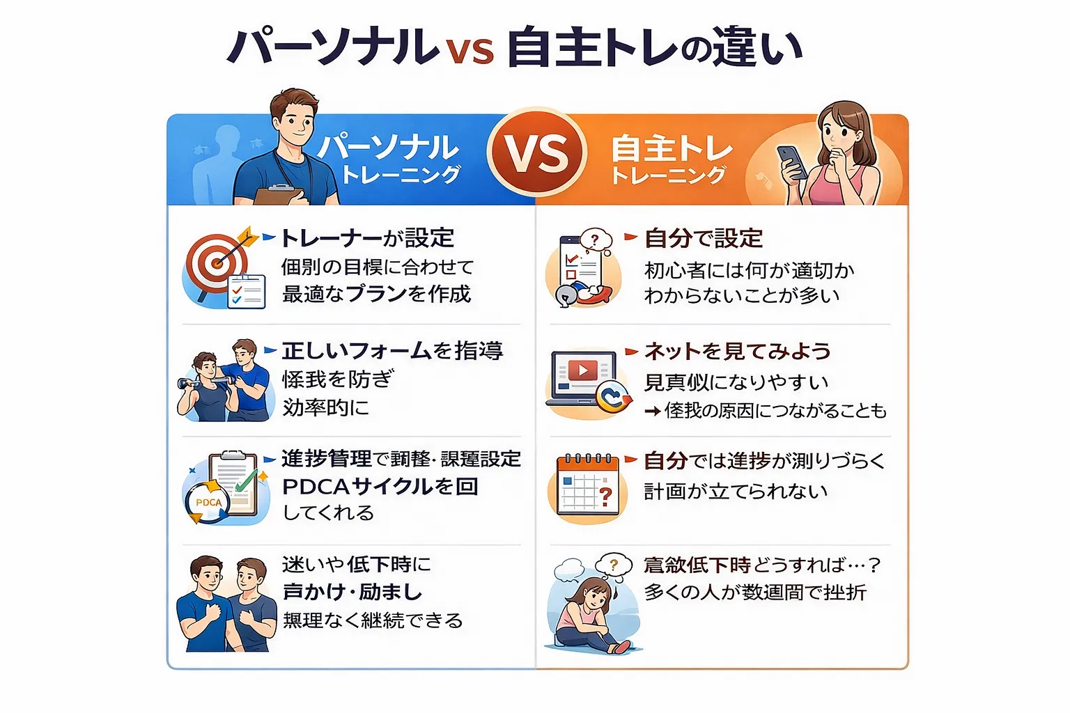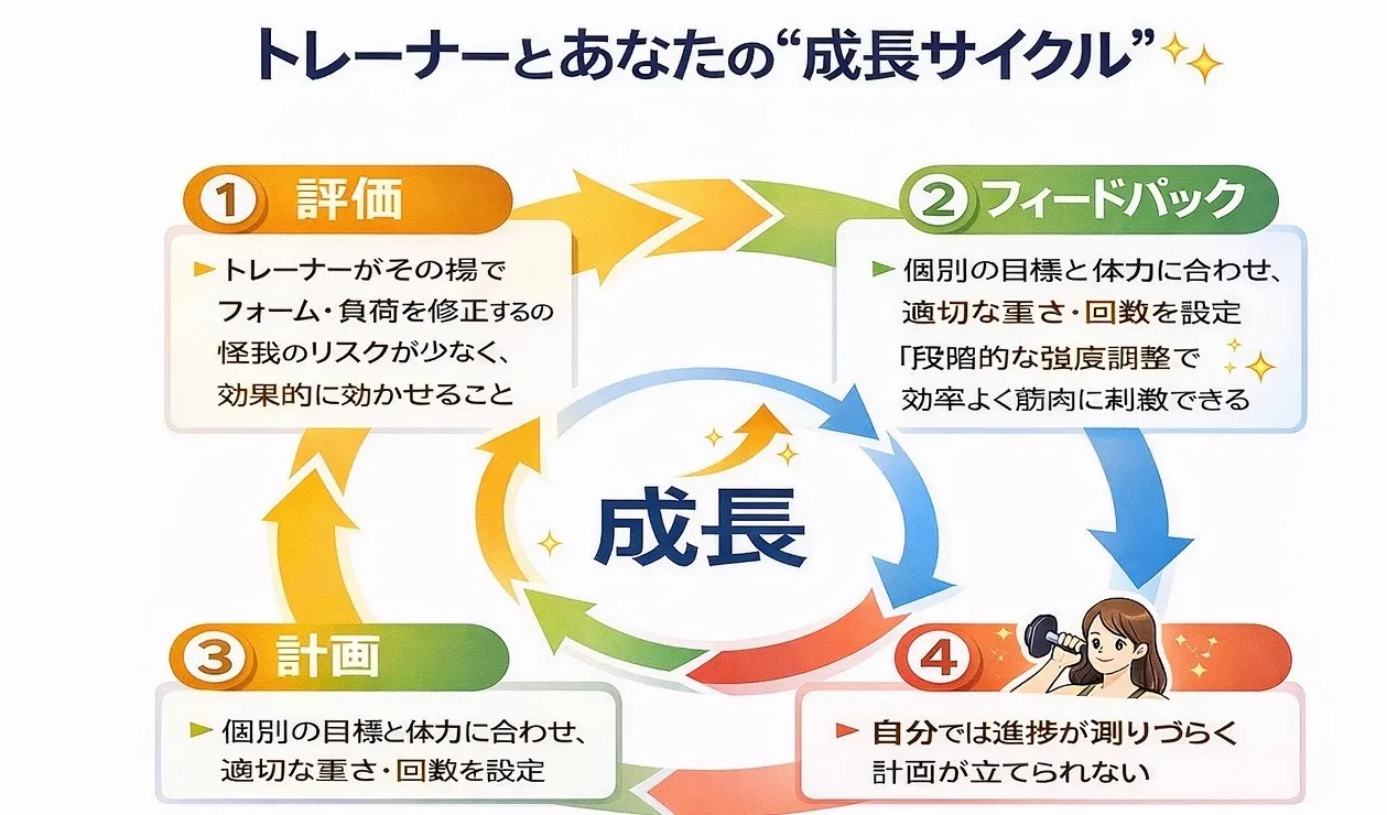 一方、トレーナーとのマンツーマンでは、その日の体調に応じた負荷を調整し、正しい動作のチェックで怪我のリスクを最小化する進め方が可能です。