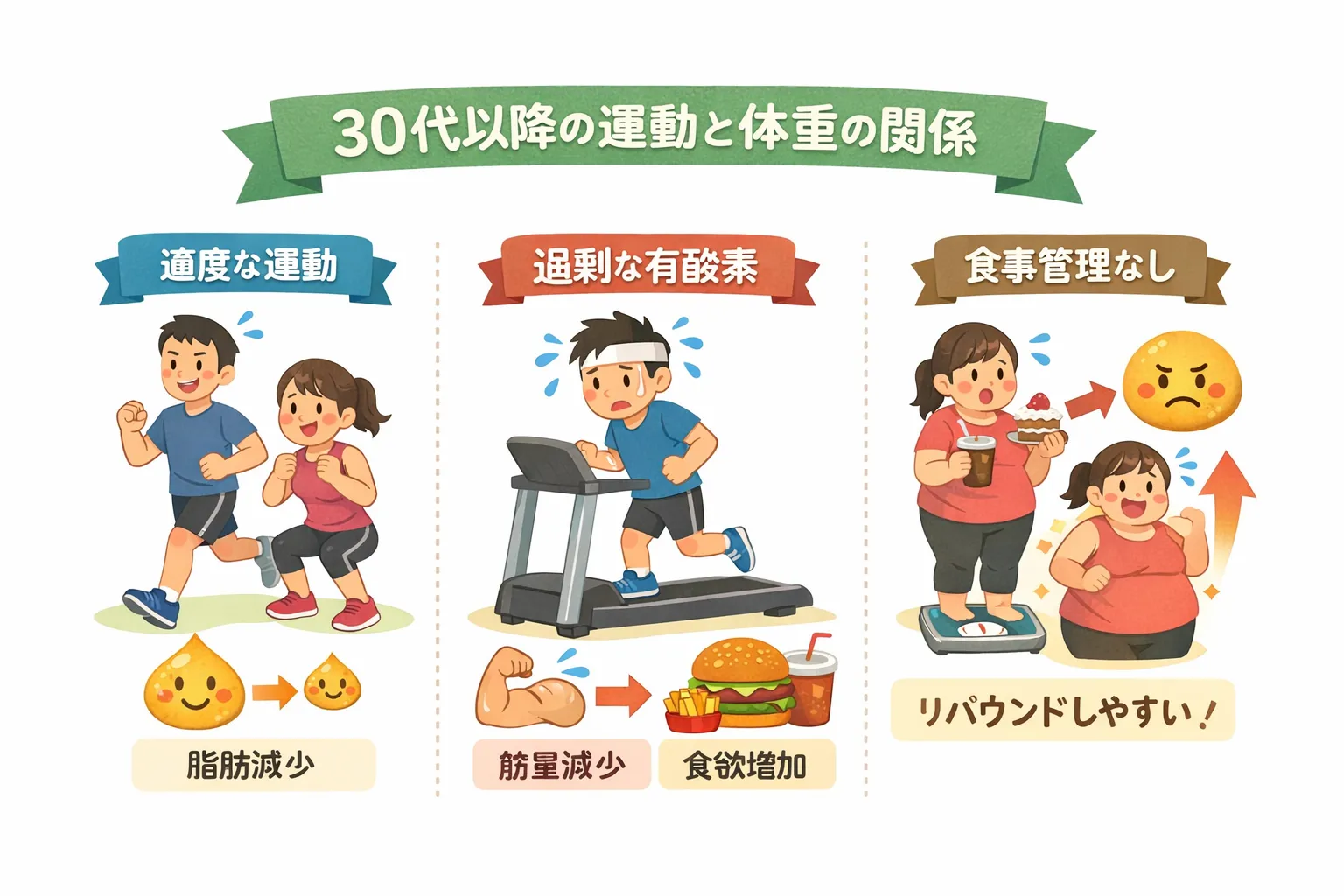30代以降は「有酸素+筋トレ+食事」のバランスが大切。