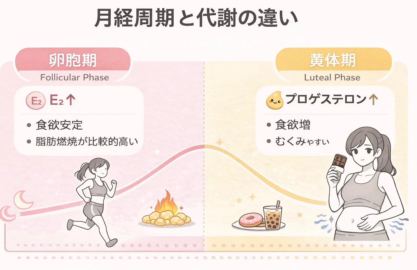 逆に生理前(黄体期)は食欲が増す傾向があるため、
