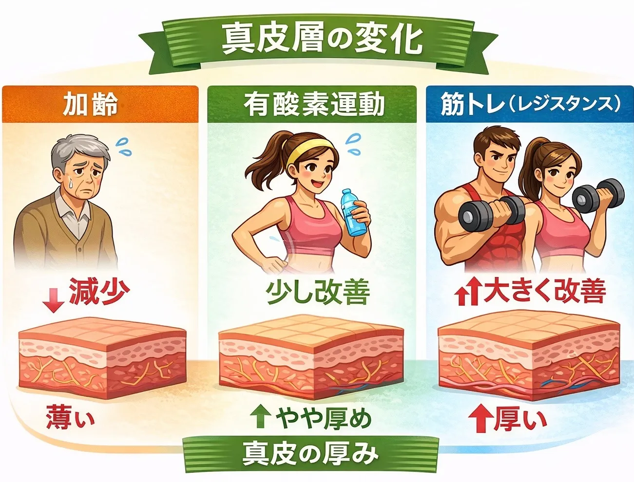 👉 レジスタンストレーニング(筋トレ)は、真皮層を厚くする効果があるという報告があり、これが“見た目の若さ”に関係している可能性が示されています。