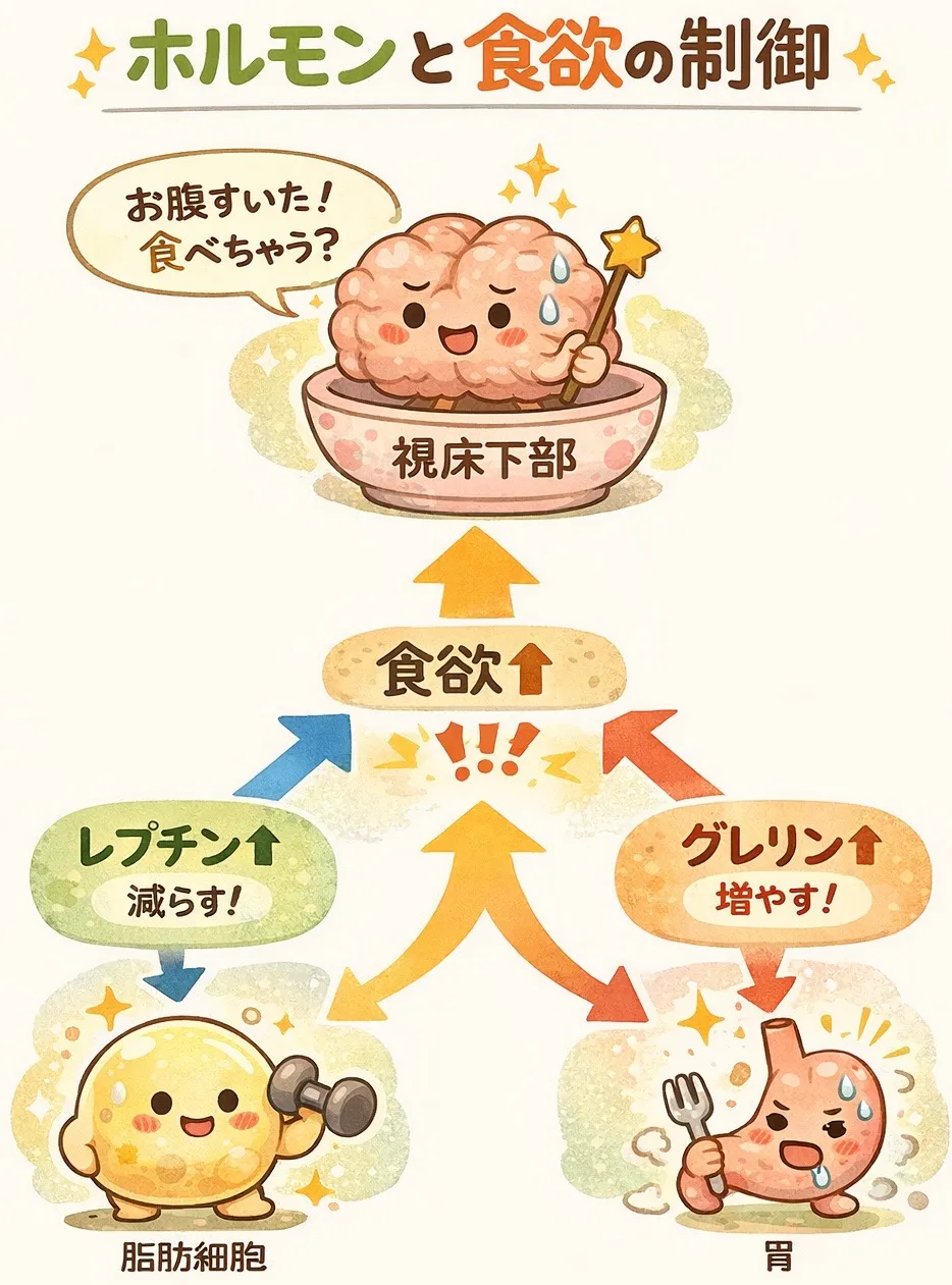 **食欲は脳(視床下部)とホルモン(レプチン・グレリンなど)**によって複雑に制御されています。