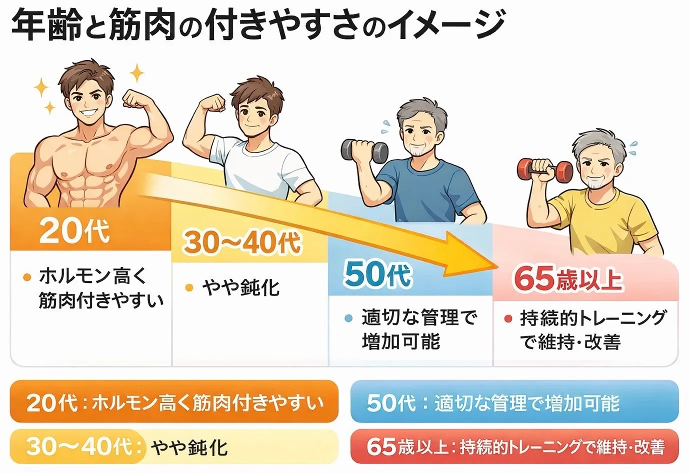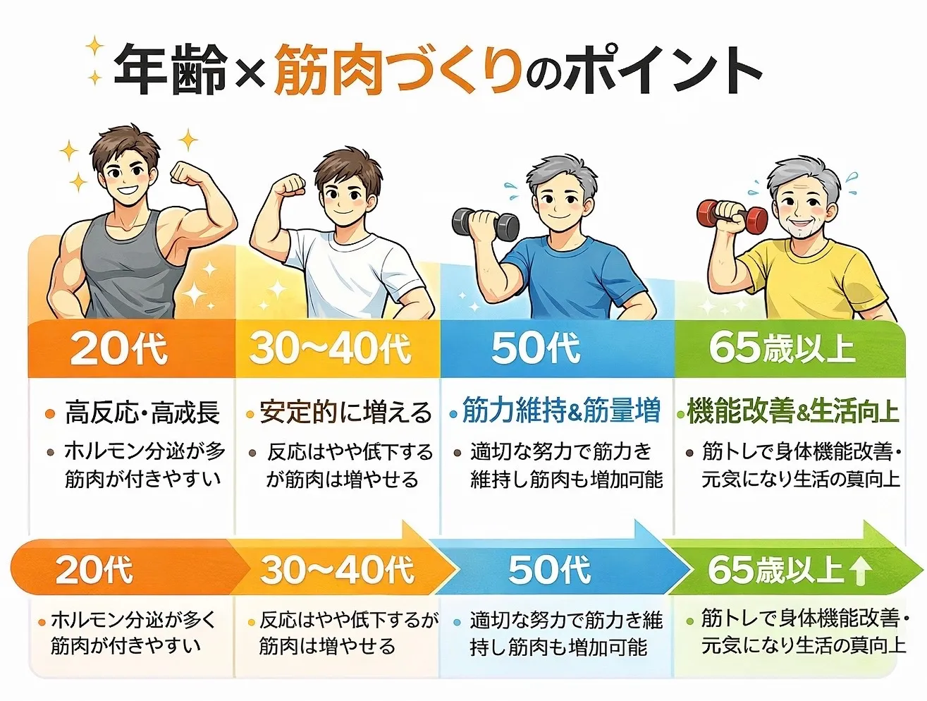 「年齢」は確かに筋肉合成・代謝に影響しますが、「筋肉が付かない」ということではありません。むしろ年齢に合った方法で進めれば、どの世代でも筋肉づくりは可能です。