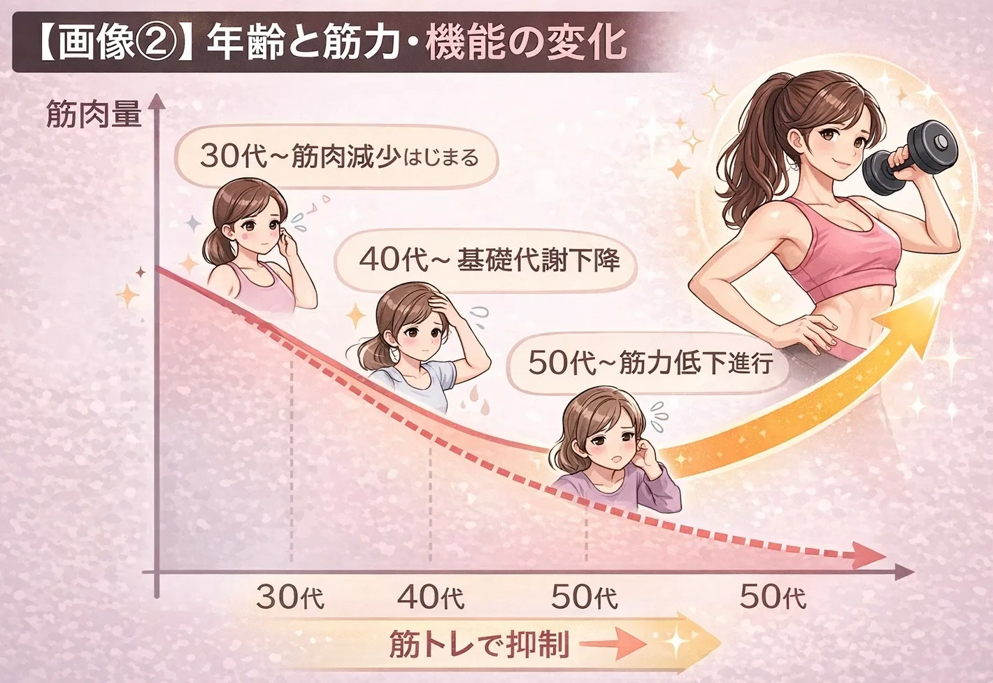 女性は年齢を重ねると、筋肉量が徐々に減少していきます。