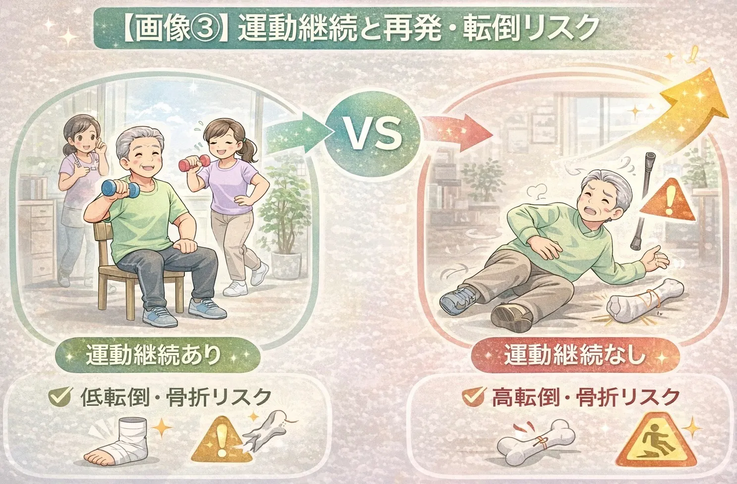 ✔ 運動継続は転倒・骨折リスクの低下など健康面でも利益がある