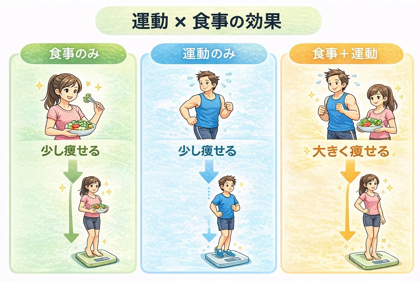 「運動だけ vs 食事+運動」で比べると、
