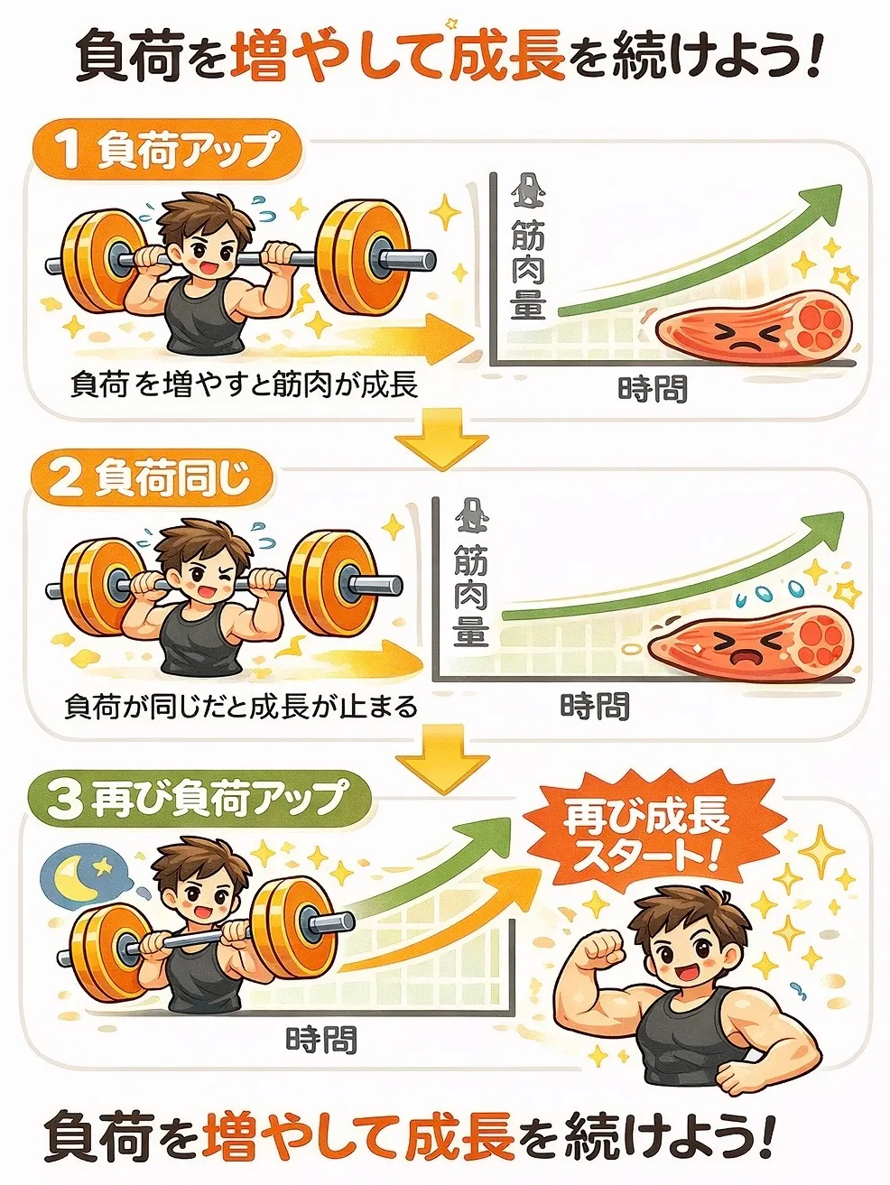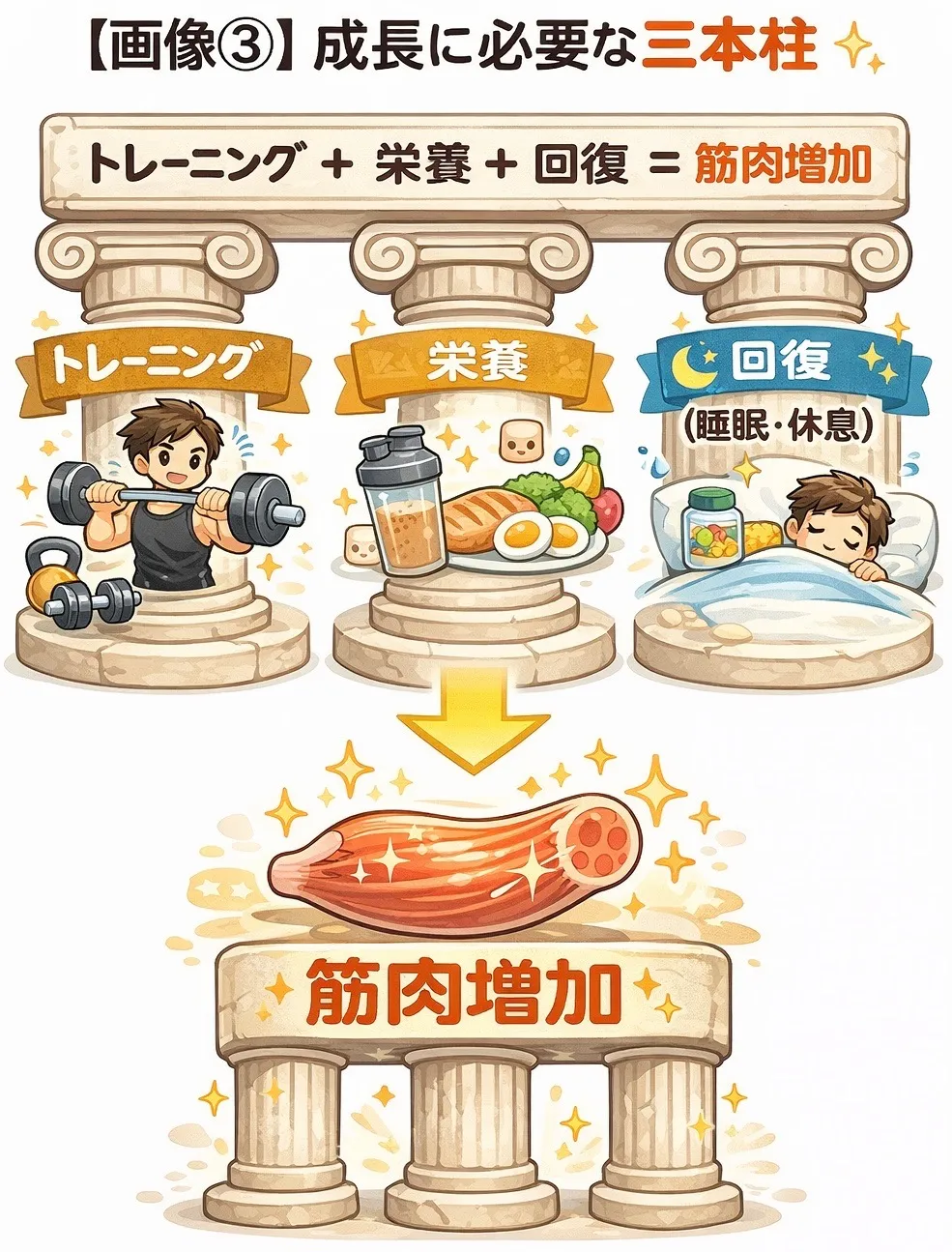 ➡ 筋肉が増えるまでには「時間・負荷・栄養・回復」がすべて揃わないと進まない