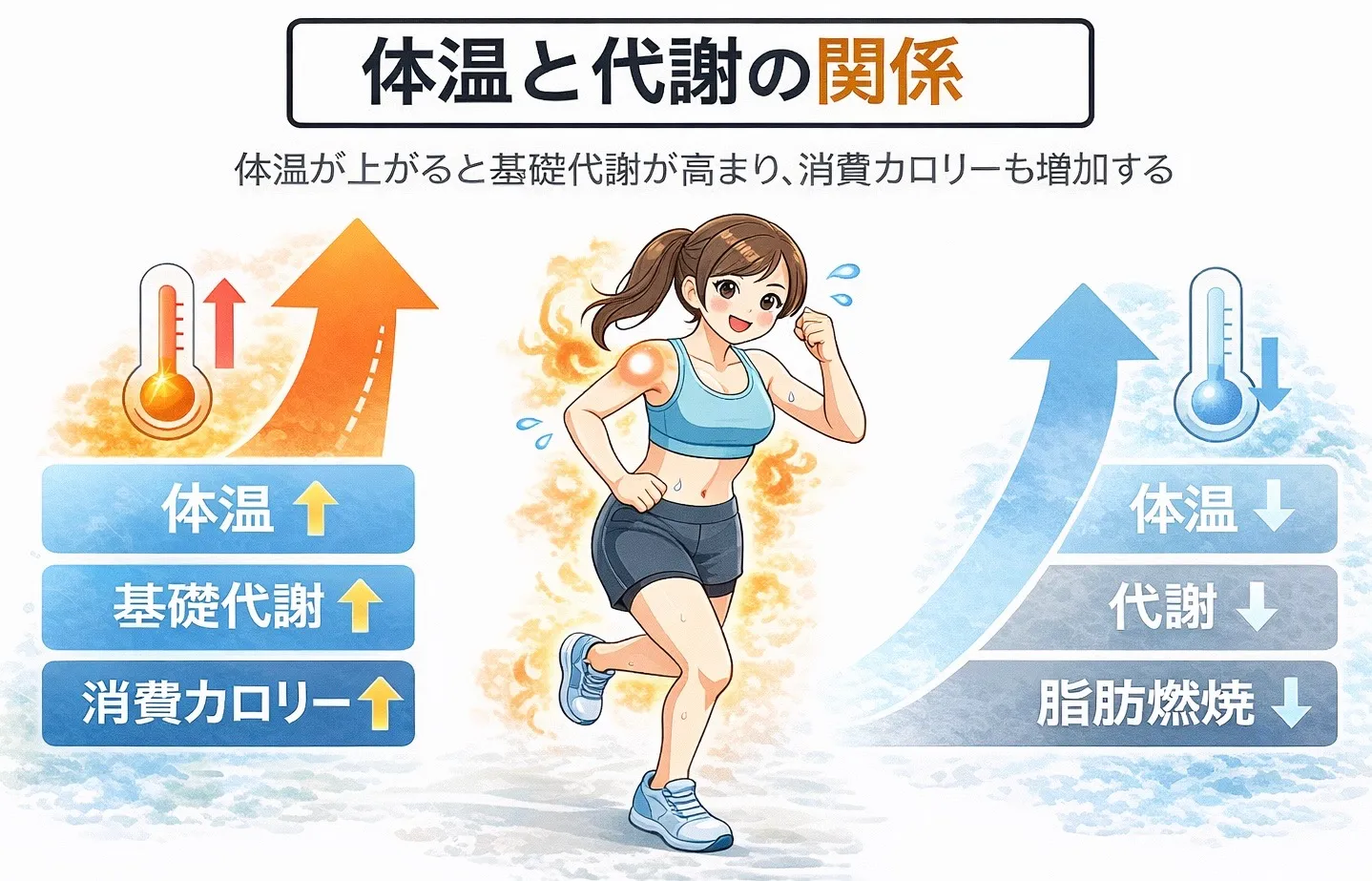 これは実証された直線関係ではなく「体温が代謝やホルモン調節・熱産生・栄養処理といった複数の面でダイエットに寄与する方向性がある」という見解です。