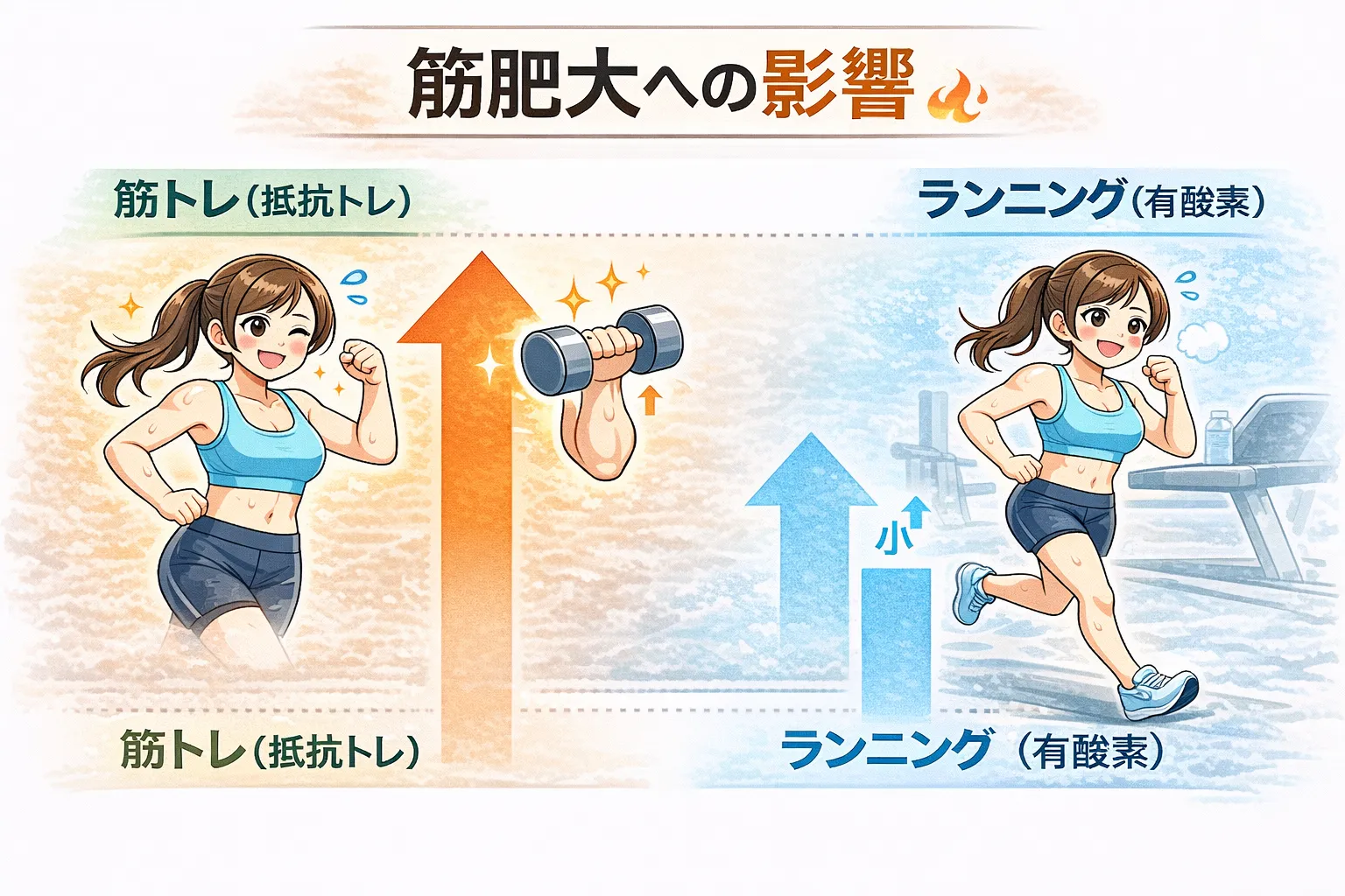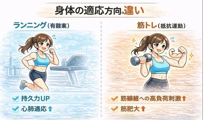 実はランニング(有酸素運動)は健康や心肺機能には高い効果を持つ一方で、筋肉を大きくする(筋肥大)という点では抵抗トレーニング(筋トレ)とは性質が大きく異なります。