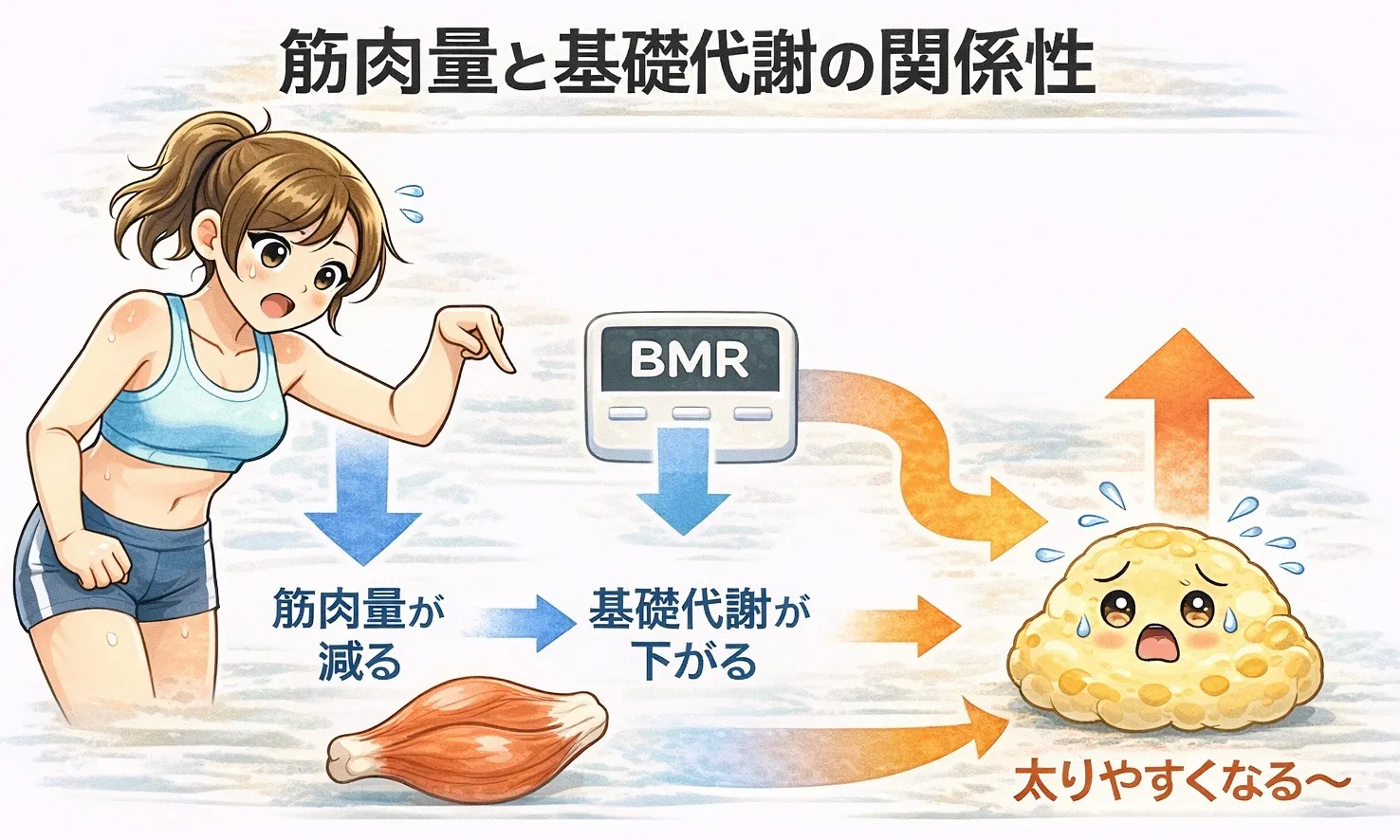 ✔ 筋肉量の減少は基礎代謝低下につながり、リバウンドしやすい体質を作る。