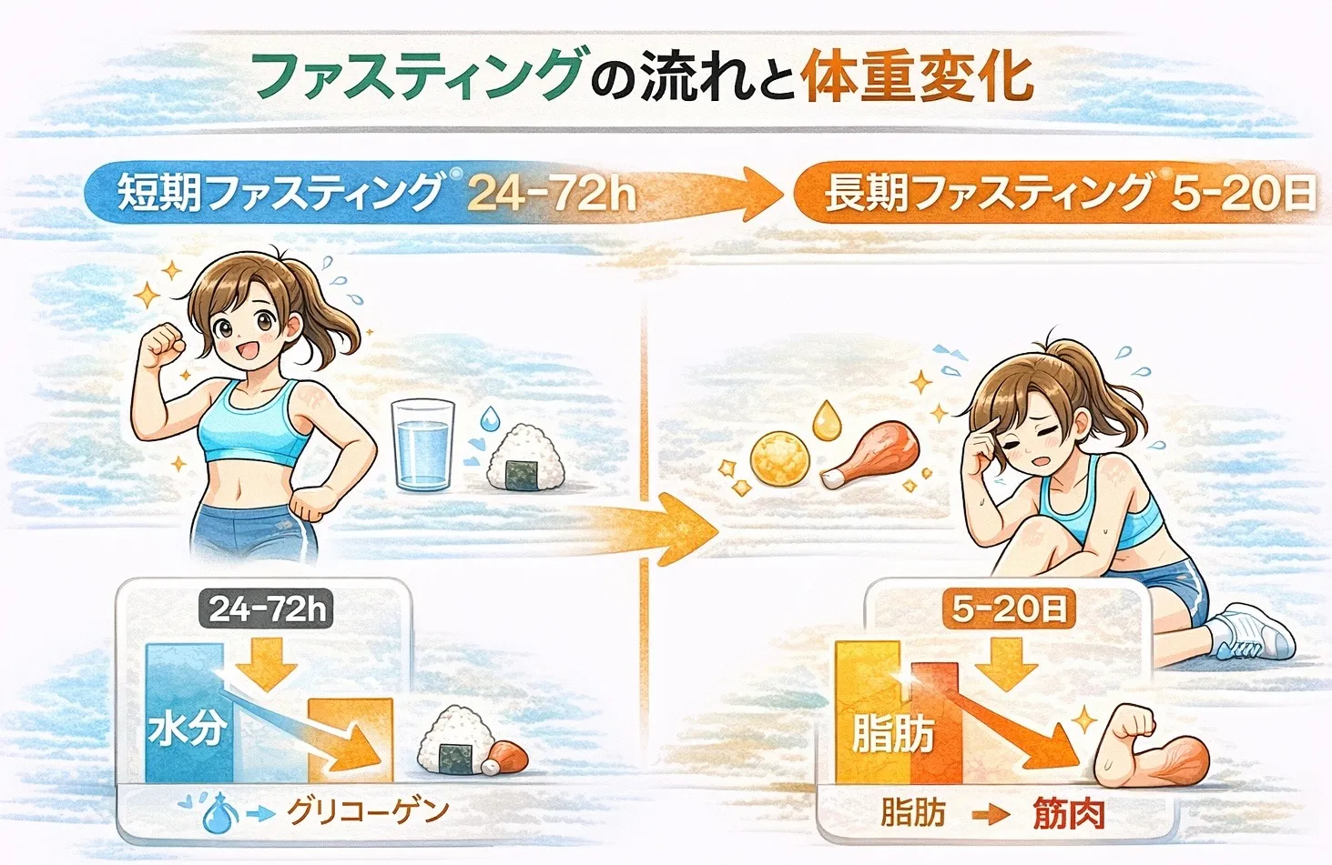 ファスティング中に失われた筋肉は、回復食や通常の生活に戻った後もすぐには回復しません。
