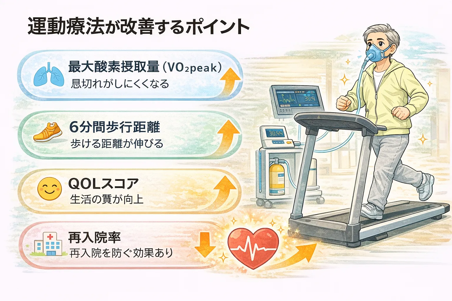 心臓のポンプ機能、酸素を全身に届ける能力(心拍出量・VO₂peak)を改善します。これは運動耐容能向上や再入院リスク低下と関連しています。