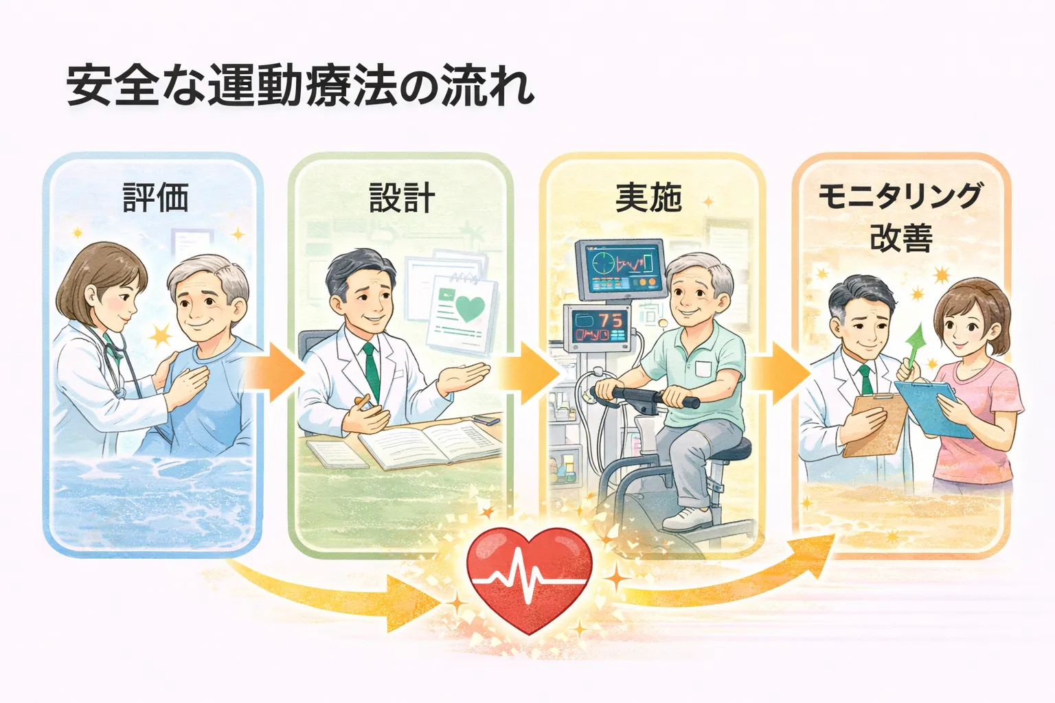 複数の臨床研究でも、安定期の心不全患者が運動療法を行うことで生活機能が改善し、心不全悪化が抑えられたという報告があります。