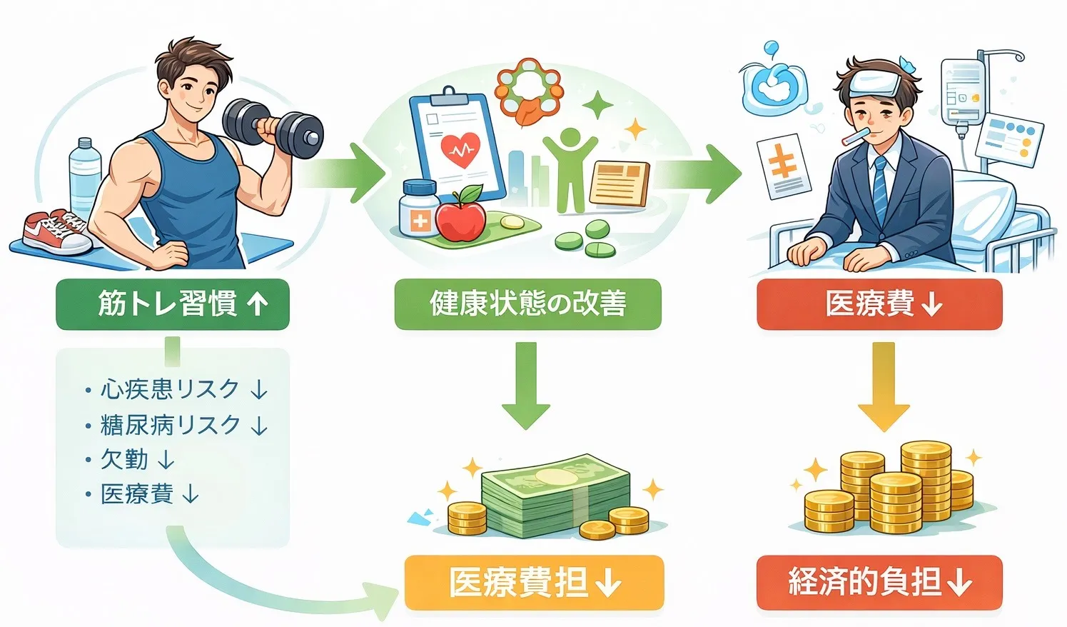 ✔ 定期的な筋力トレーニングは健康リスクを減らし、医療費・欠勤リスクを軽減する。