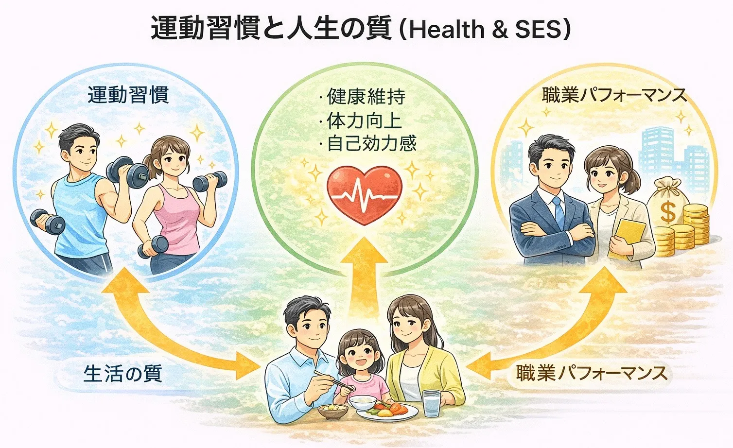 実は筋力トレーニングを含む定期的な運動は、単に身体機能を高めるだけでなく、健康・収入・社会的地位(SES: Socioeconomic Status)の関連を示す研究データも存在します。