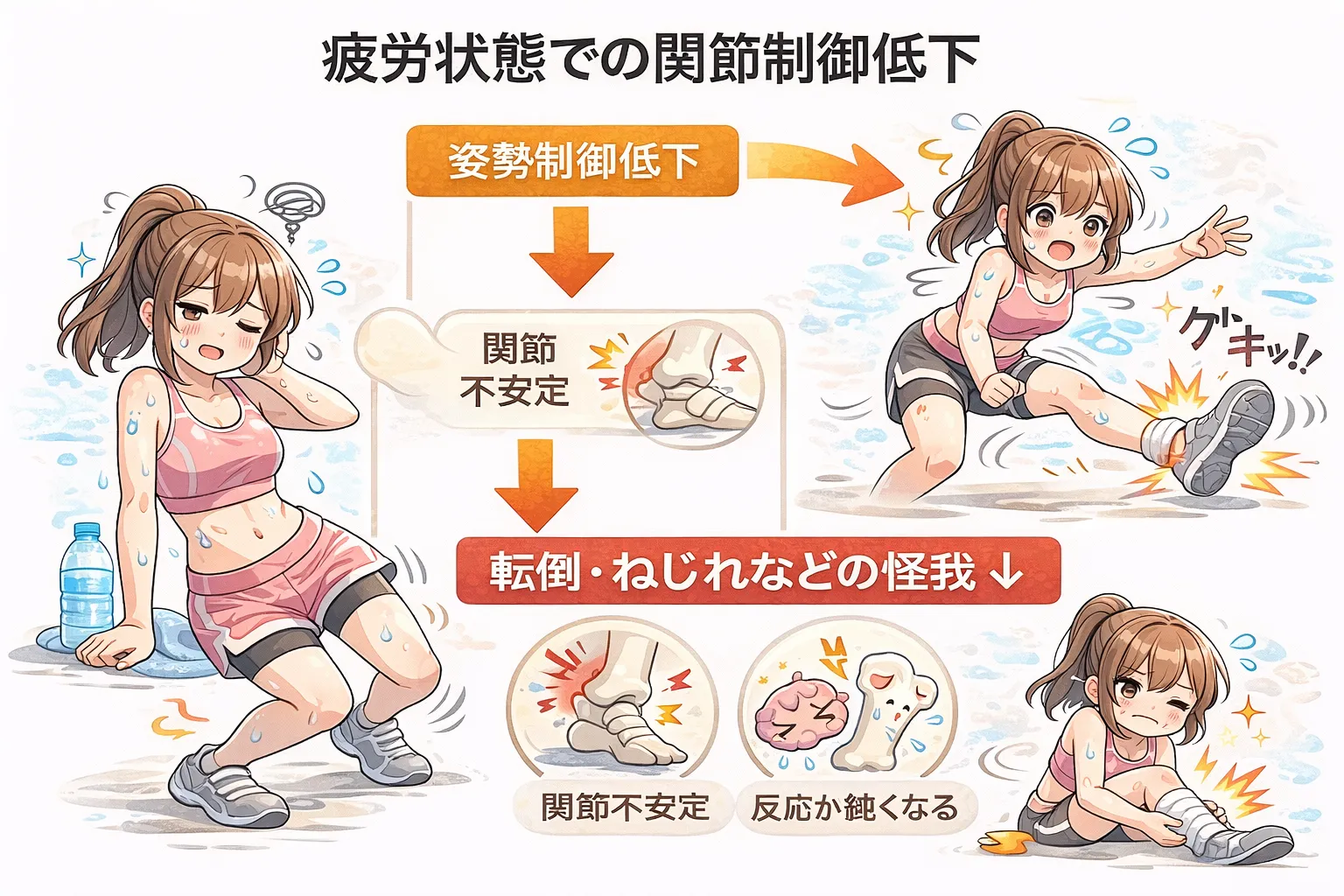 疲労が蓄積している状態では、筋肉の反応速度が落ち、筋力が低下し、同じ動作でもより大きな負荷が関節にかかるようになります。