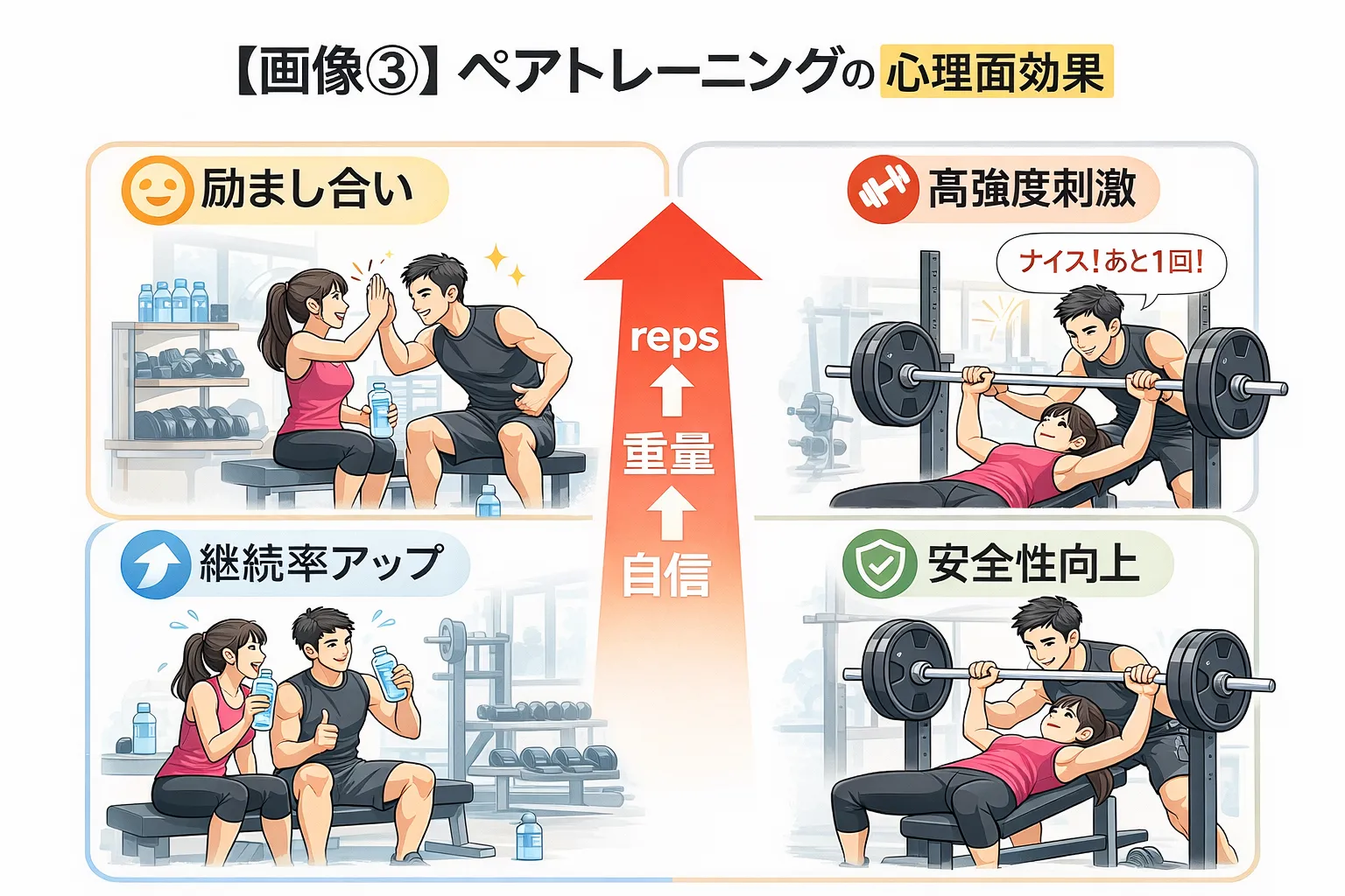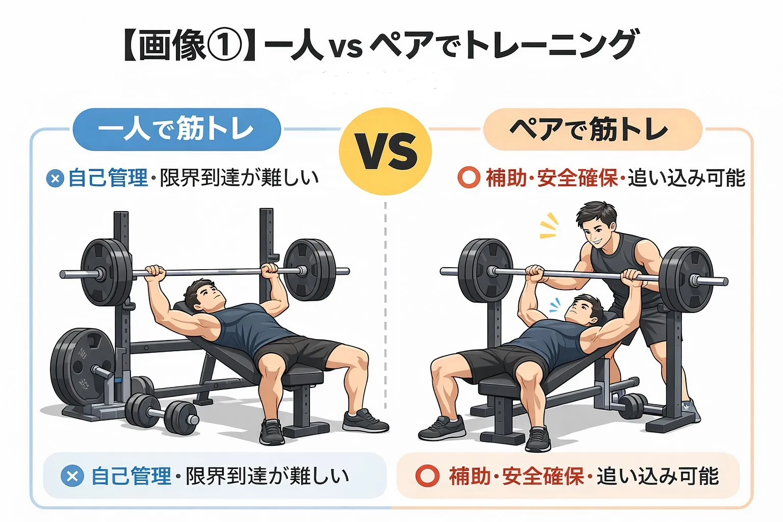 ペアトレーニングは「自分を押し上げてくれる補助者との相乗効果」で、安全 × 筋パフォーマンス最大化を生みます。