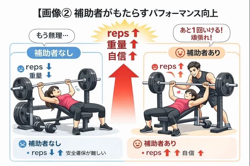 特に高重量を扱う場合、補助者がいると急な挫折や重量失敗による怪我リスクを大きく下げられます。