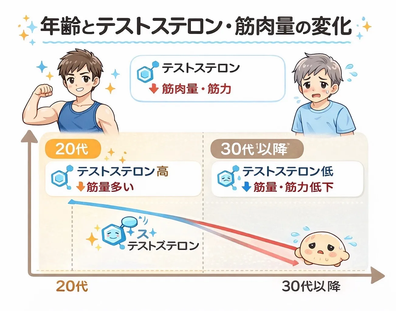 ✔ 年齢とともにテストステロンは自然に低下する傾向があり、筋肉量・筋力の低下と関連する可能性が複数研究で示されている。
