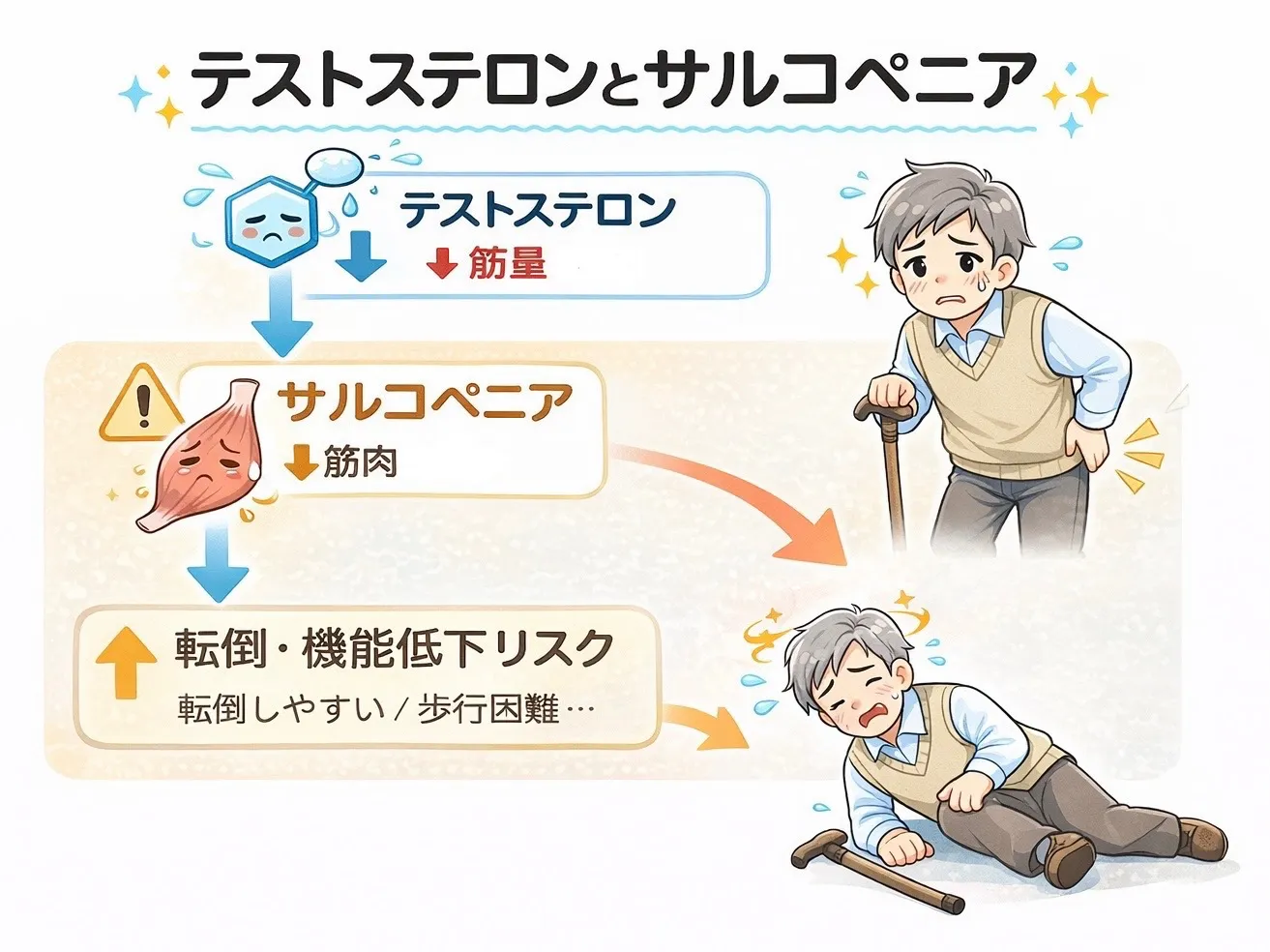 ✔ 低いテストステロンはサルコペニアや生活機能低下リスクにつながる可能性がある。
