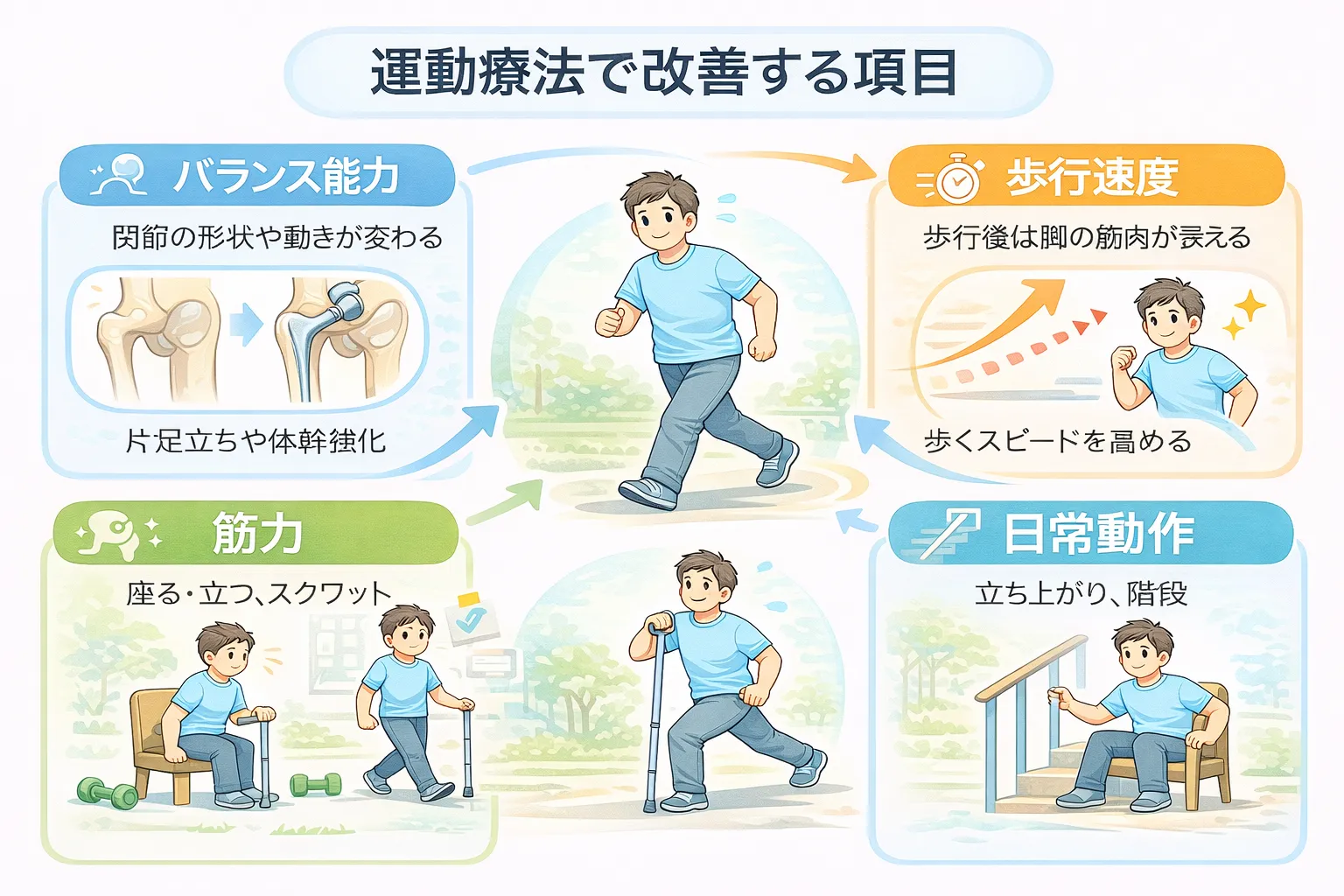 ✔ 運動は歩行能力やバランスの改善につながり、生活機能を高めます。