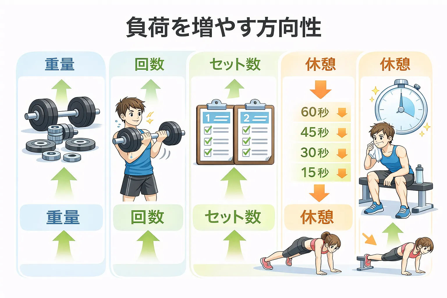 ✔ 負荷は重量だけでなく、回数・セット数・休憩・種目バリエーションでも調整できます。
