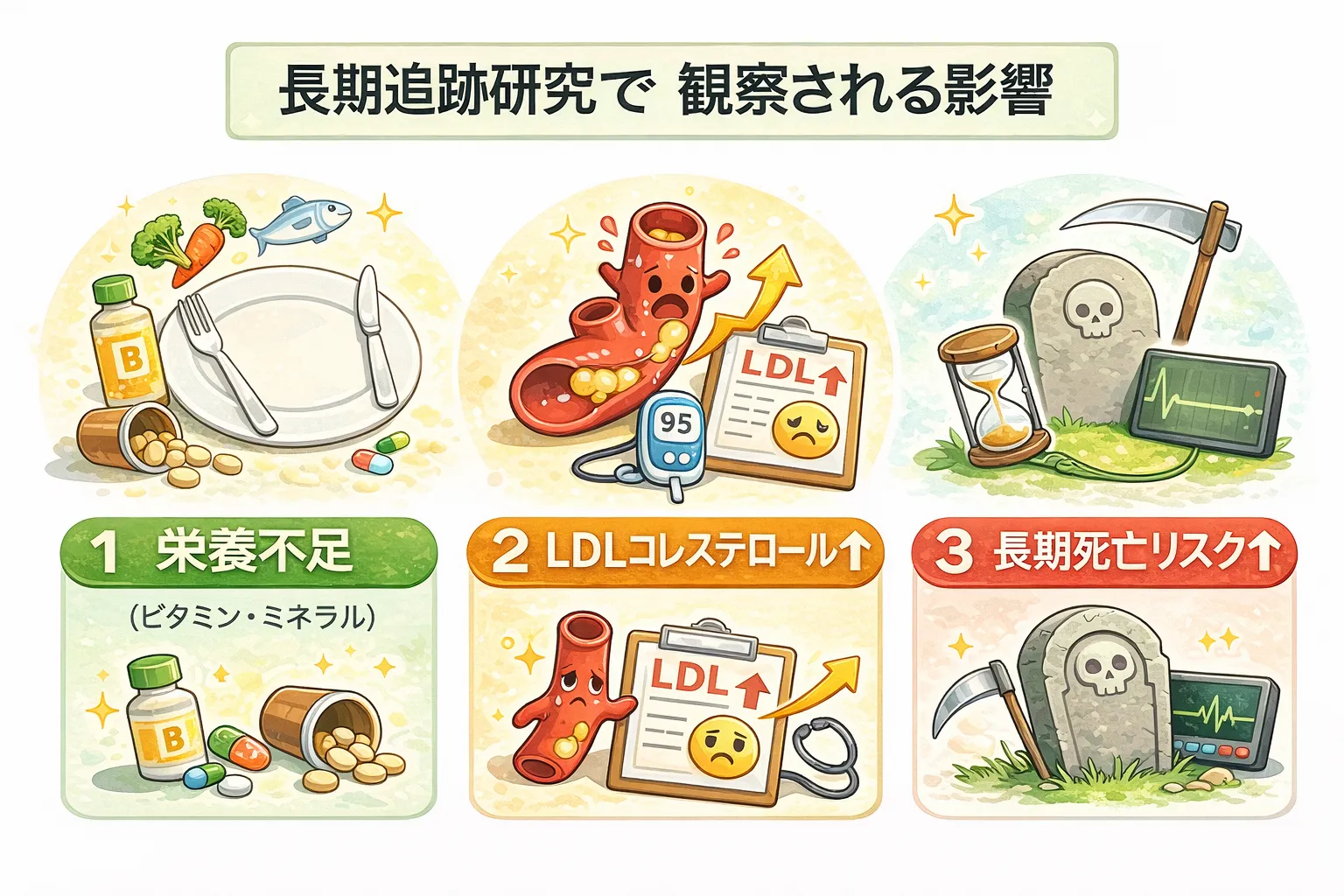 ✔ 長期的な健康リスク(死亡リスク、脂質異常、栄養不足など)が観察されている研究がある。