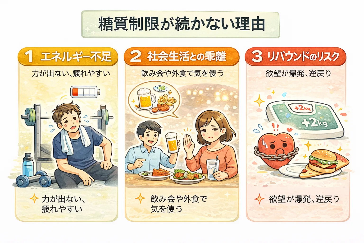 極端な糖質制限は、日常生活や社会的な食事の場面で続けにくいという実態があります。