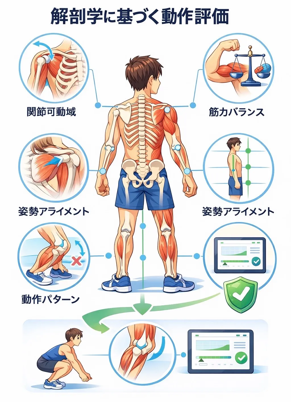✔ 解剖学・動作分析に基づいた評価力で 怪我のリスクを科学的に予測・回避できます。
