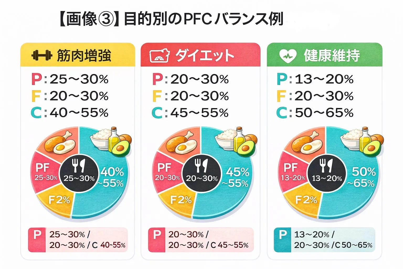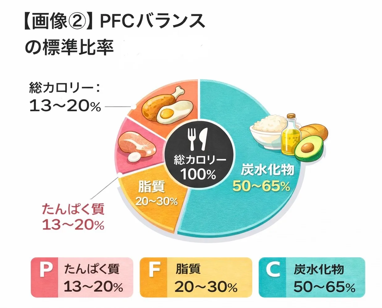 ✔ 標準的な目安(P13〜20% / F20〜30% / C50〜65%)は、健康維持とダイエットの土台になります。