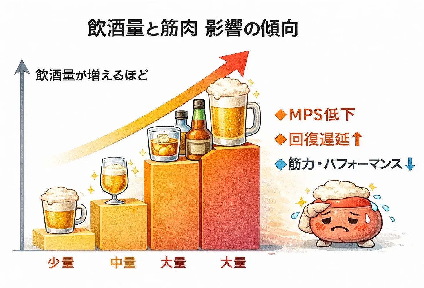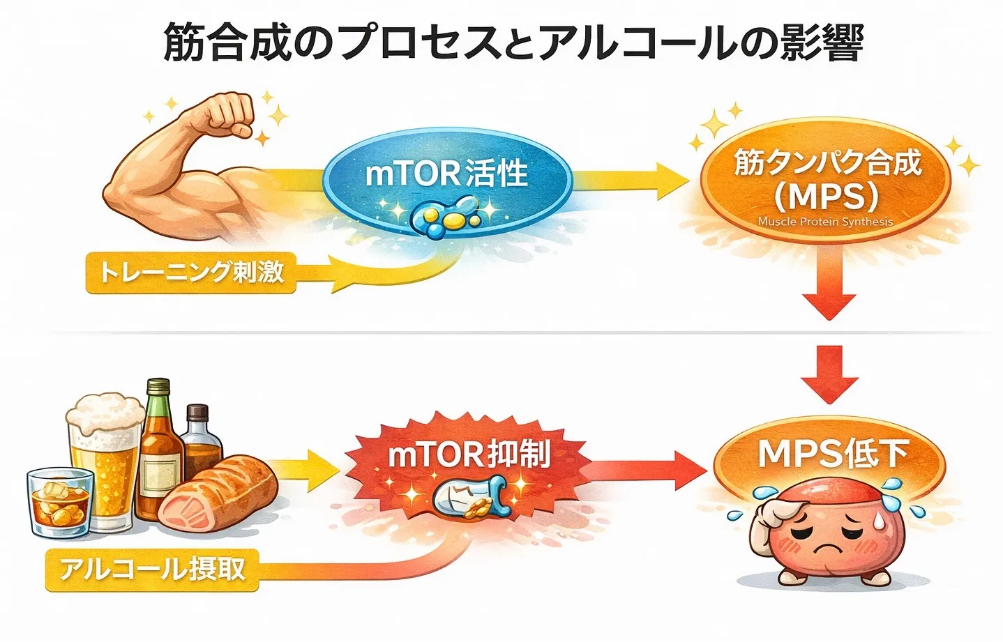 MPSはトレーニング直後の数時間にピークを迎え、ここでの合成効率が筋肥大・回復の鍵になりますが、アルコールの摂取はこのMPSを有意に低下させることが複数の研究で示されています。