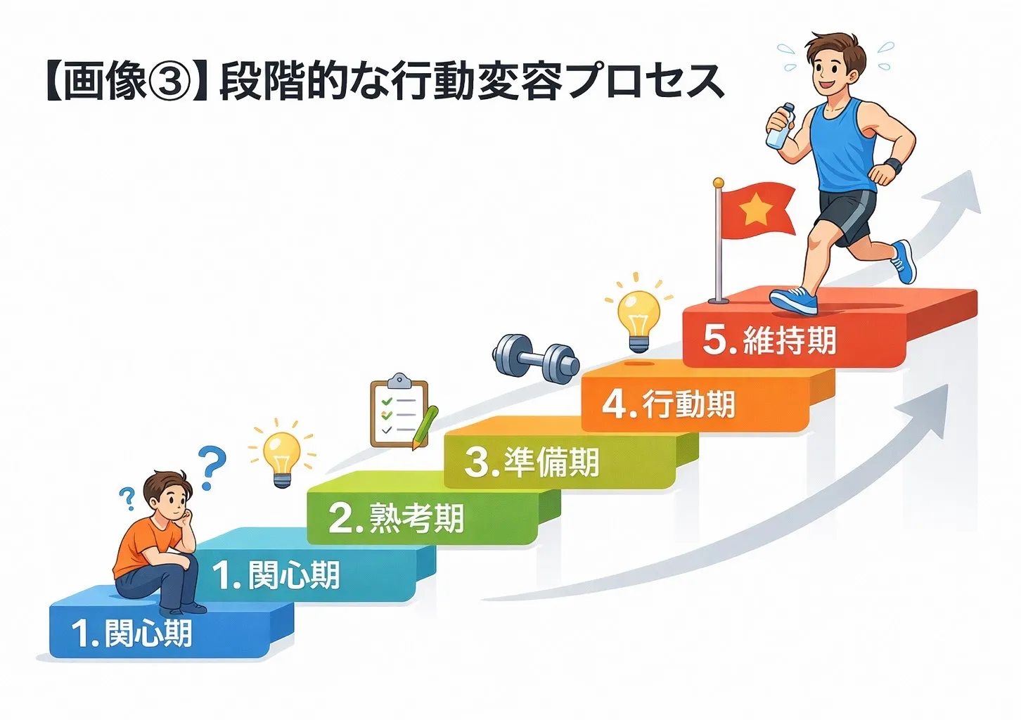 この方法は、行動変容を促す トランスセオレティカルモデル(TTM) の考え方にも合致しており、段階的な達成を自覚できる仕組みは継続行動の強化につながります。