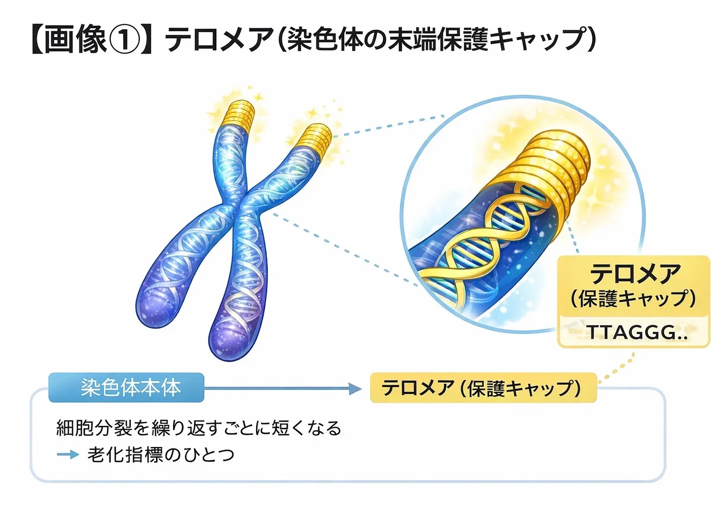 テロメアは、染色体の末端にある保護キャップのような部分で、細胞が分裂を繰り返すたびに少しずつ短くなります。