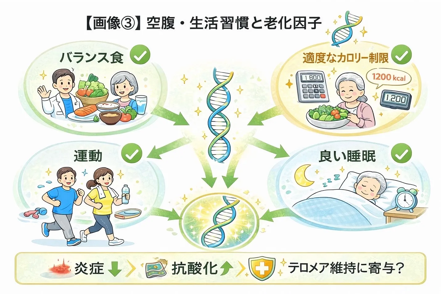 ✔ 生活習慣全体(食事内容、運動、睡眠、ストレス管理)がテロメア維持に寄与する可能性が高い。 これは単独の“空腹”だけでなく総合的な生活改善が重要である