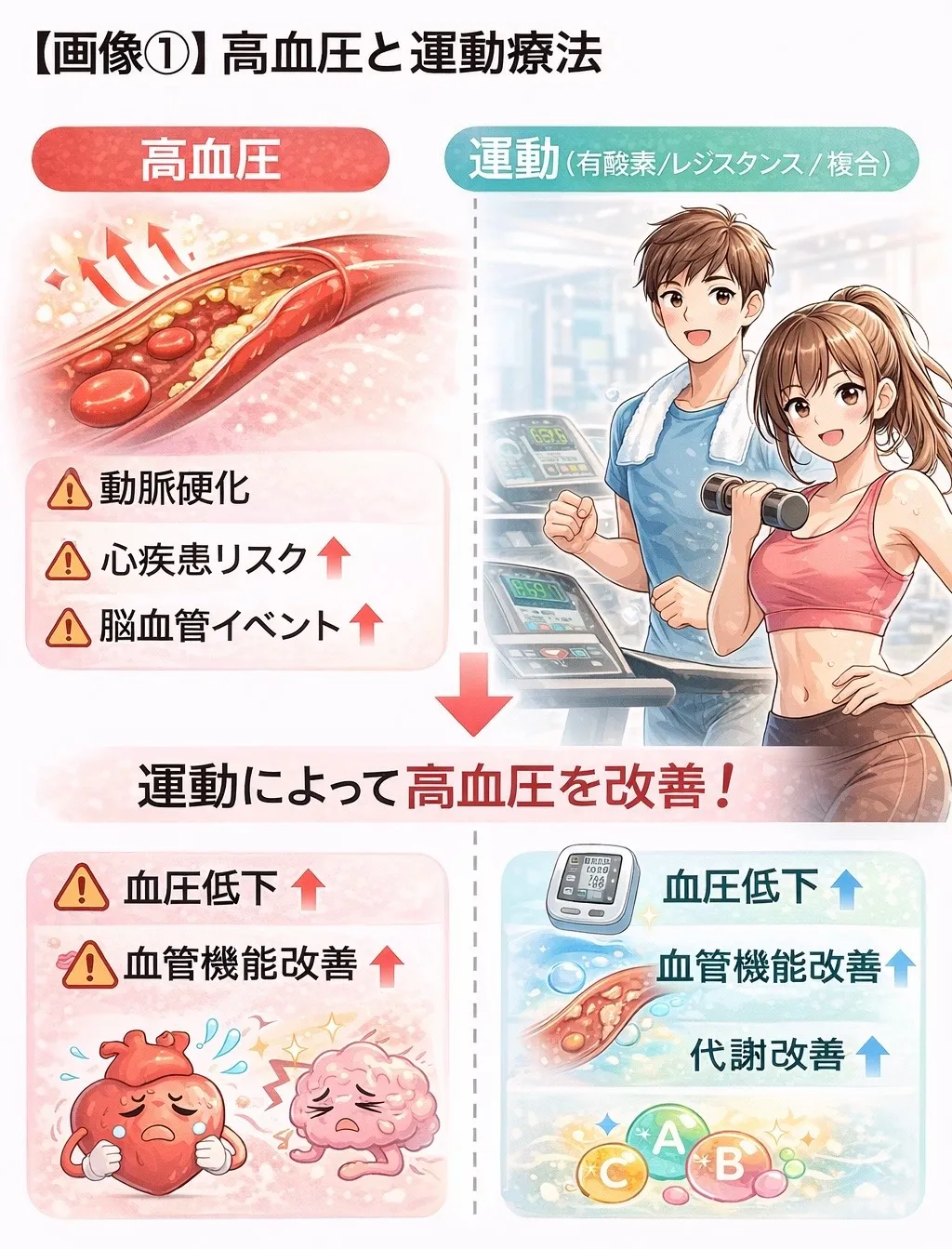 ✔ 一回の運動にも短期的な降圧効果があり、継続的な運動は安静時血圧を長期的に改善する。