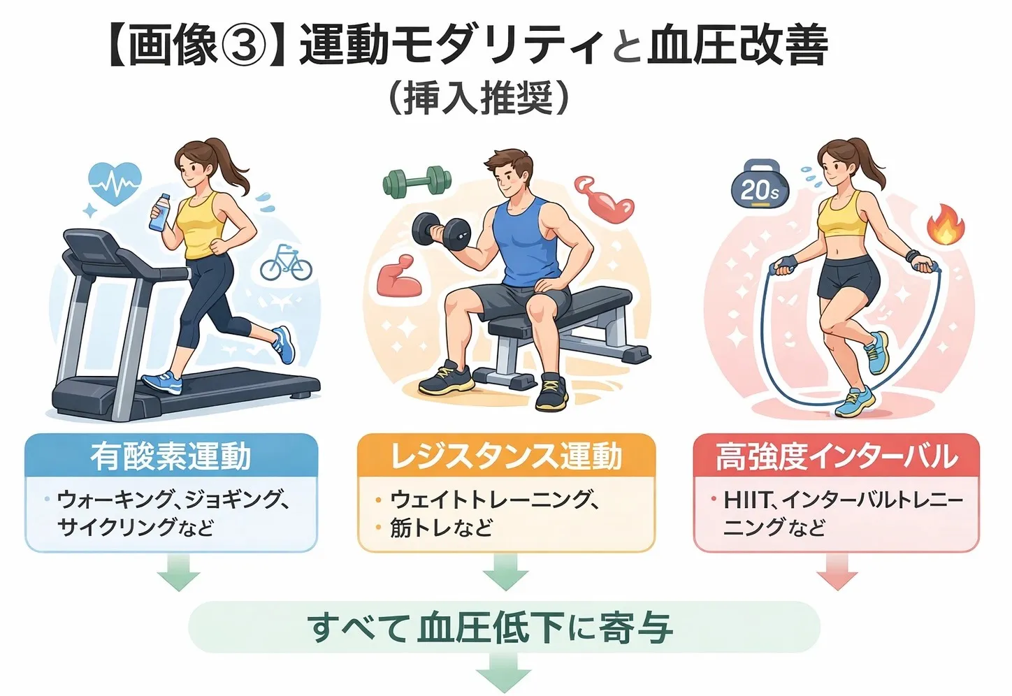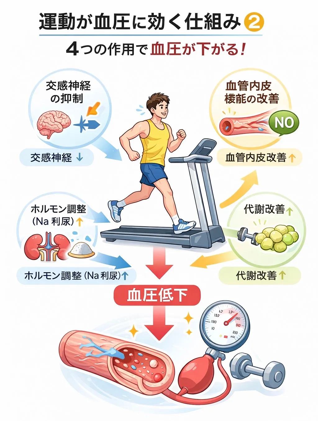 ✔ 運動は交感神経の抑制、血管内皮機能改善、ホルモン調整、代謝改善といった生理学的メカニズムで血圧を改善する。