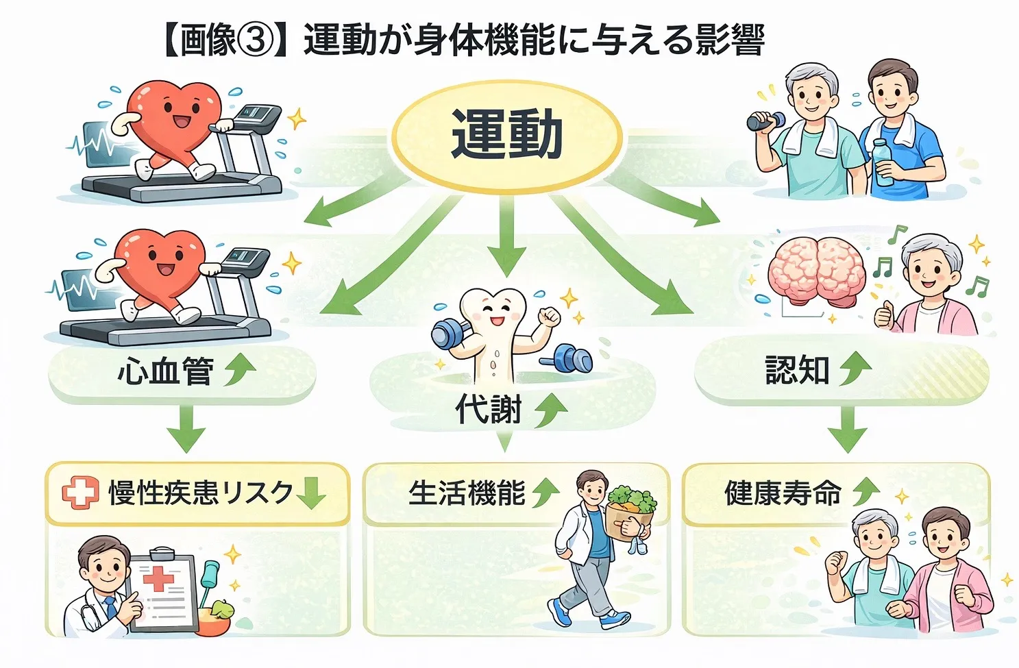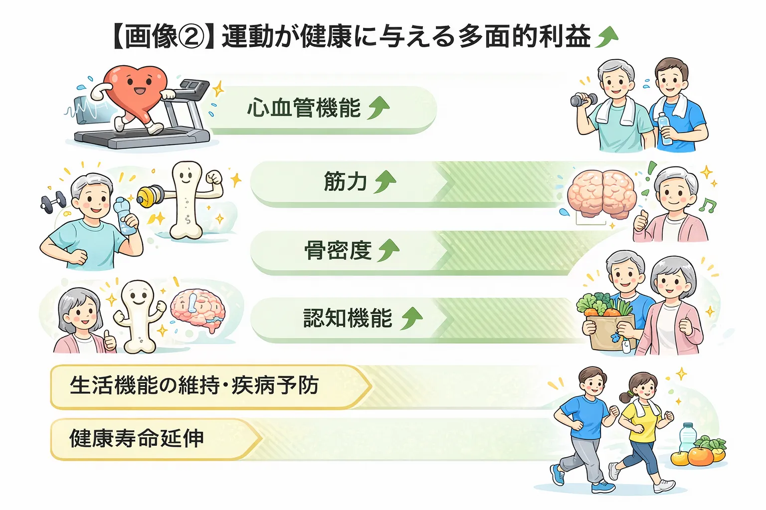 ✔ 運動は心血管機能、筋力、骨密度、代謝、脳機能など多面的に健康を支える。