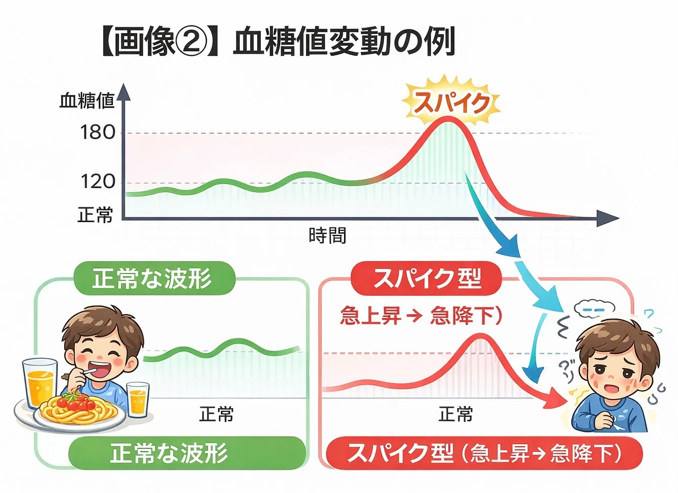 通常、食後の血糖値はゆるやかに上昇し2時間以内に戻りますが、スパイクが発生するとその変動が非常に激しくなります。