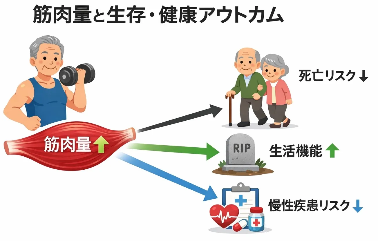 こうした結果は、筋肉量が“単に見た目の問題”ではなく、全身の健康・代謝・生命予後に関与していることを示しています。