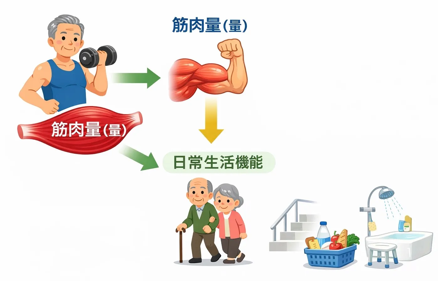 ✔ 筋力と筋量は互いに補完する健康指標であり、どちらも機能的老化予防に重要。
