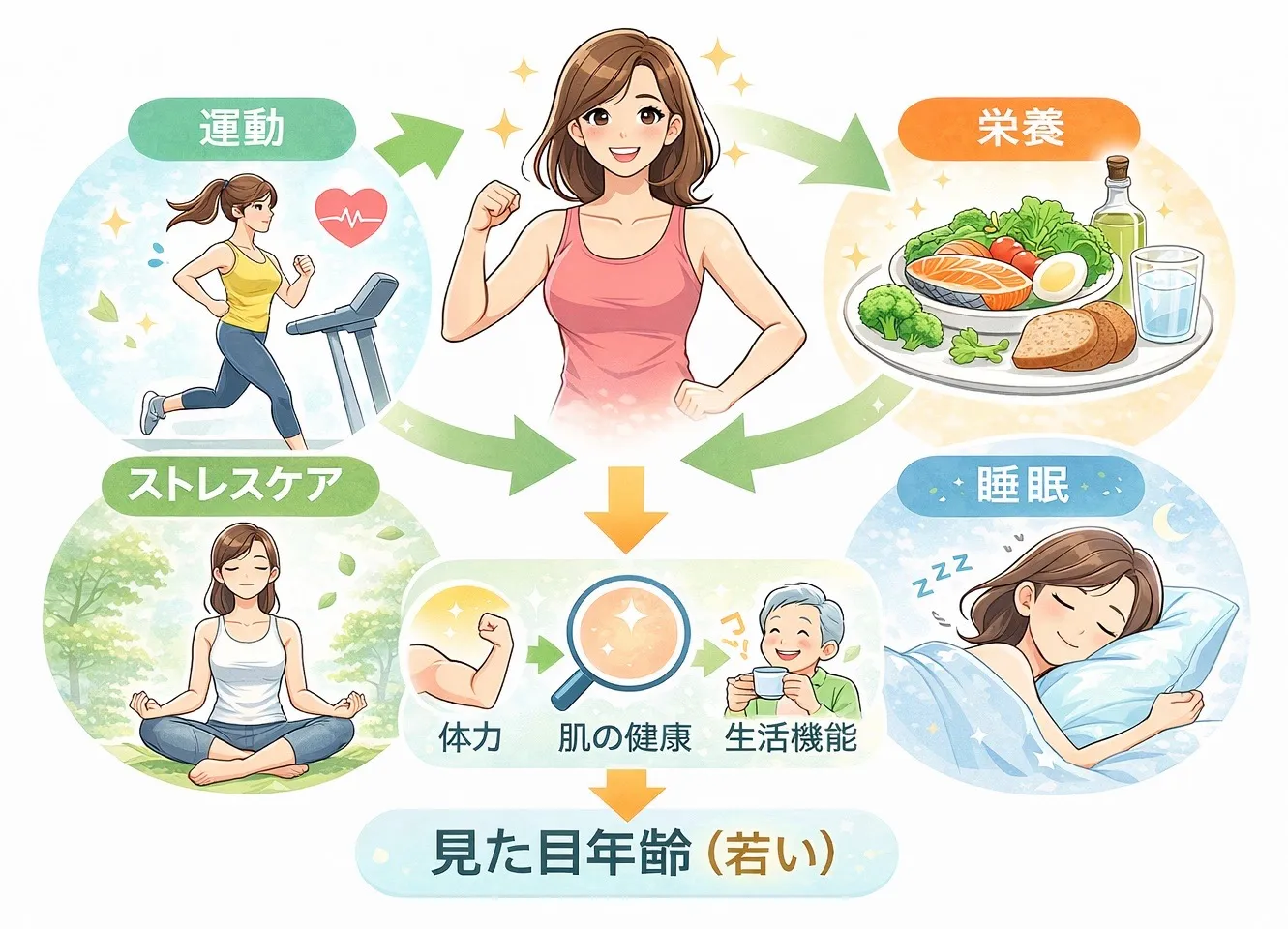 運動・食事・休息・社会活動をバランスよく保つことが若さと健康を両立します。