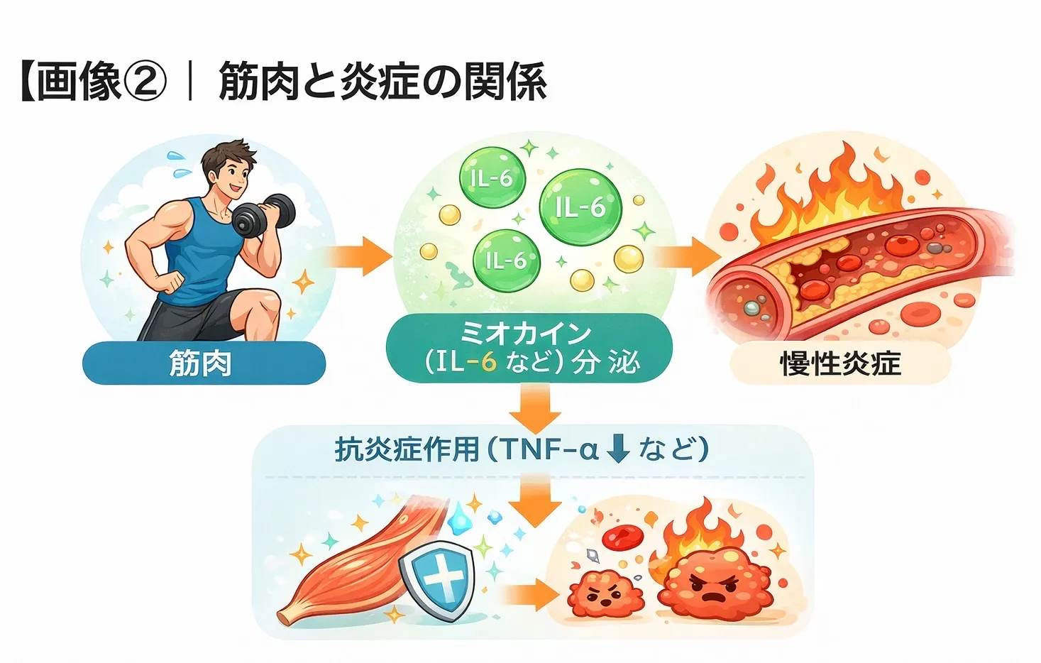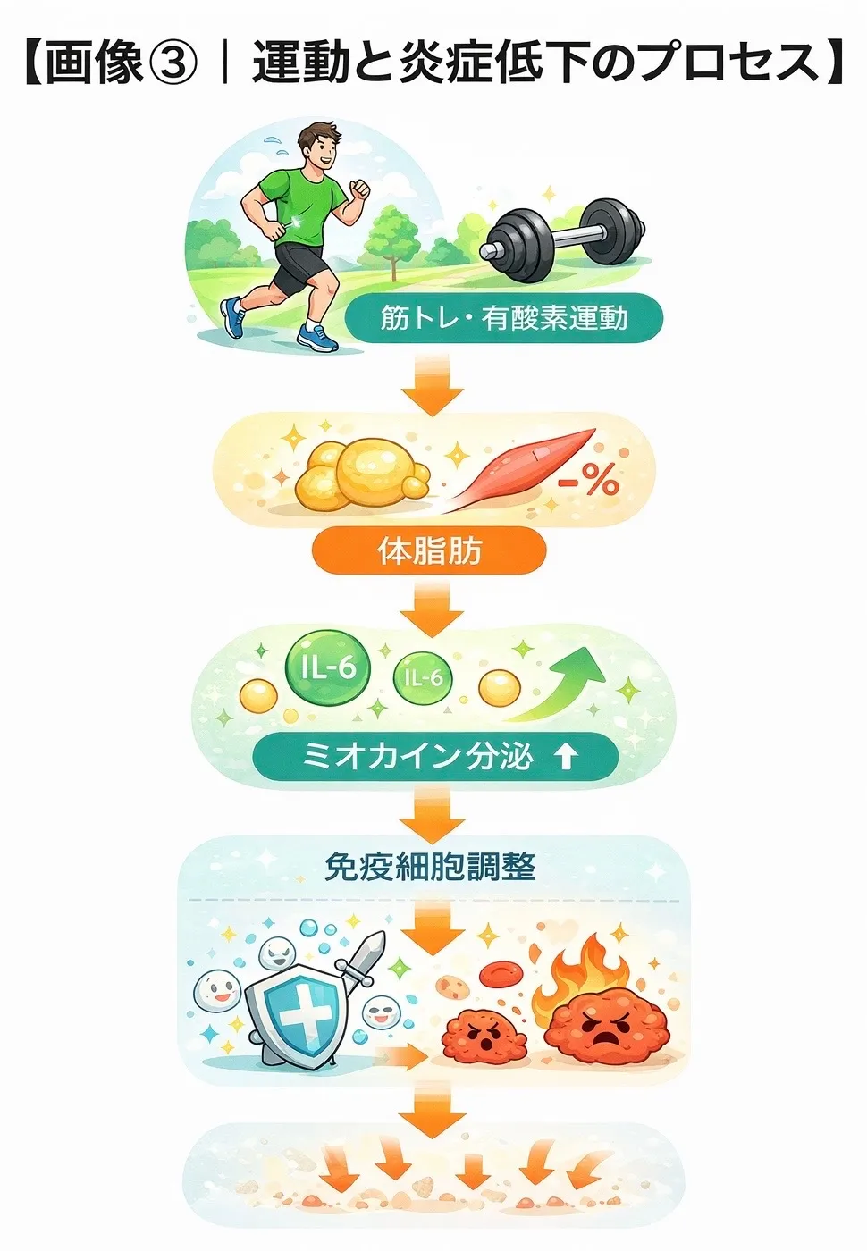 これらの筋由来シグナルは、継続的な適度な活動・筋トレによって調整され、慢性炎症を抑える方向へ働きます。