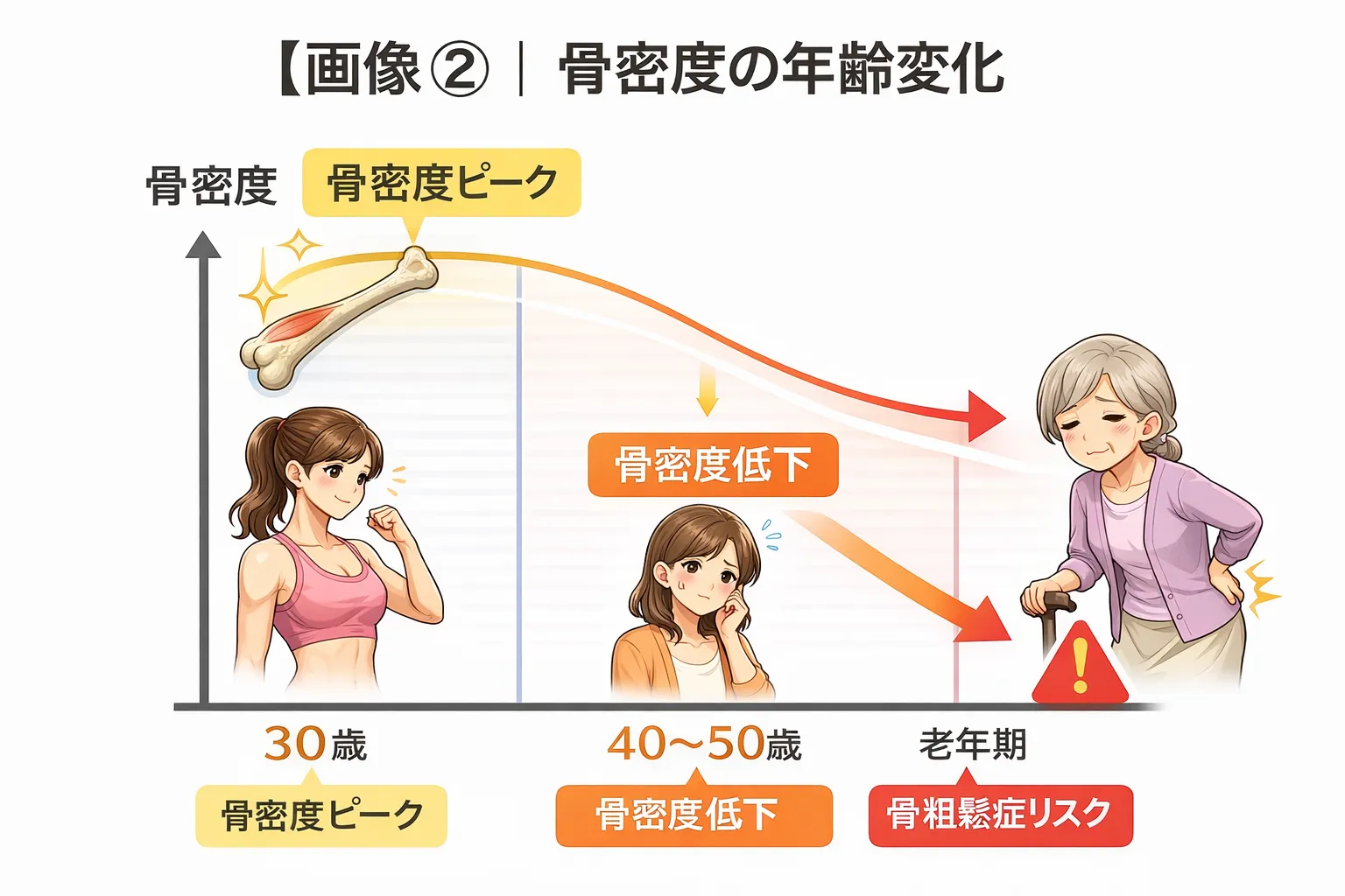 特に40〜50代以降、骨密度は年ごとに低下していく傾向があり、女性は閉経後に急激な減少がみられることが知られています。