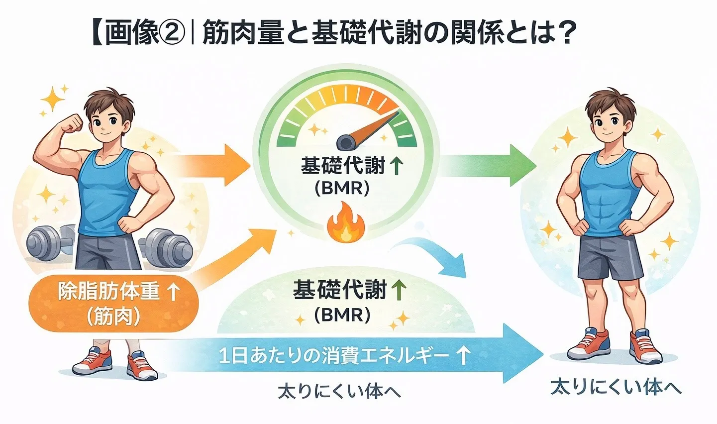 筋肉量が多い人ほど基礎代謝(BMR)が高く、太りにくい体になりやすいという関係が多くの研究で示されています。