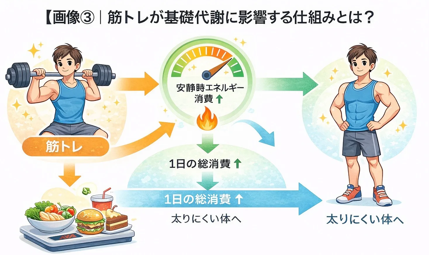 ✔ 筋トレ × 食事 × 日常活動の総合戦略で基礎代謝を上げることが、太りにくい体づくりにつながる。