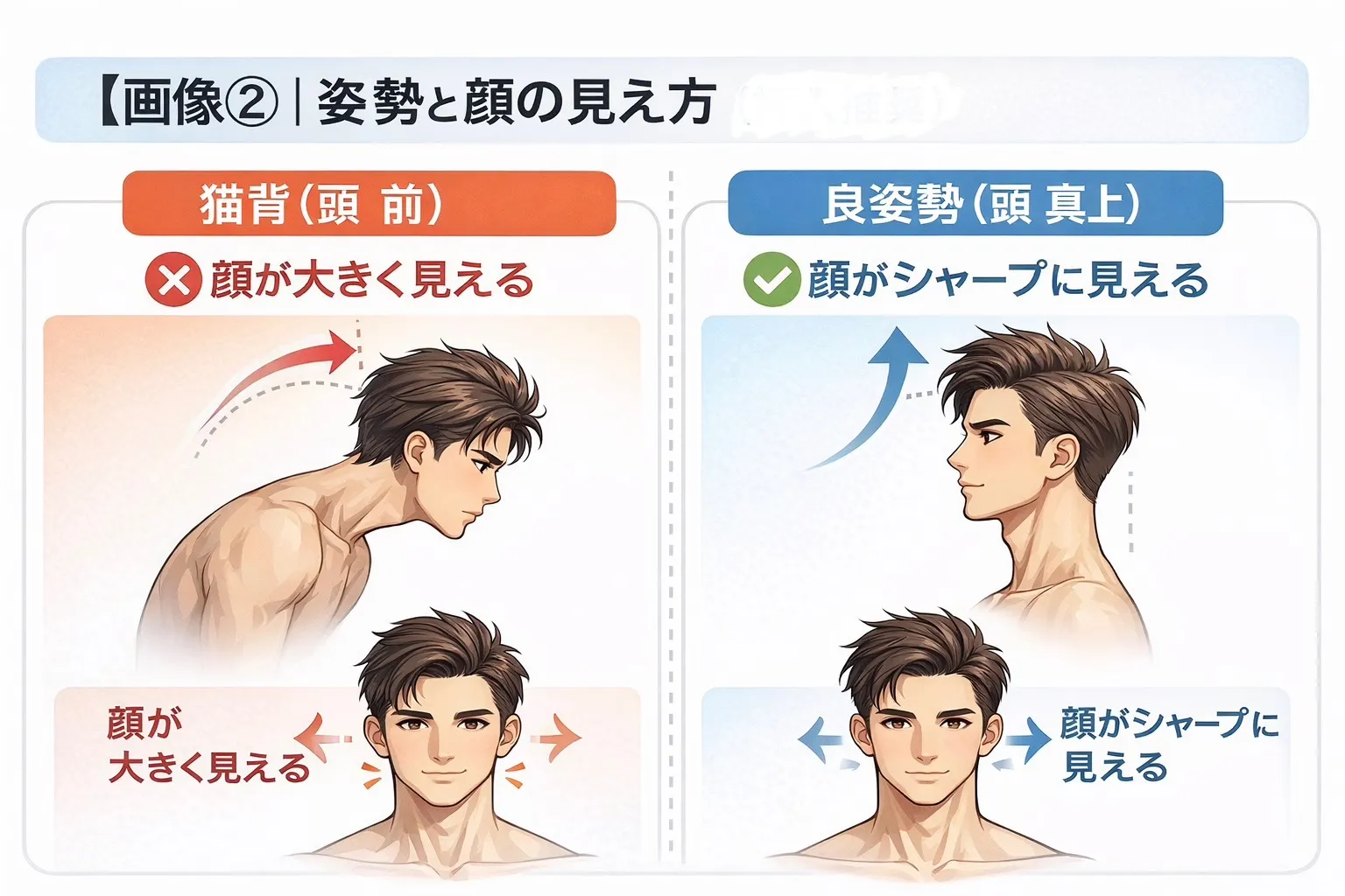 猫背や巻き肩といった不良姿勢は、頭部が前に出やすくなりフェイスラインが強調されて見えることがありますが、