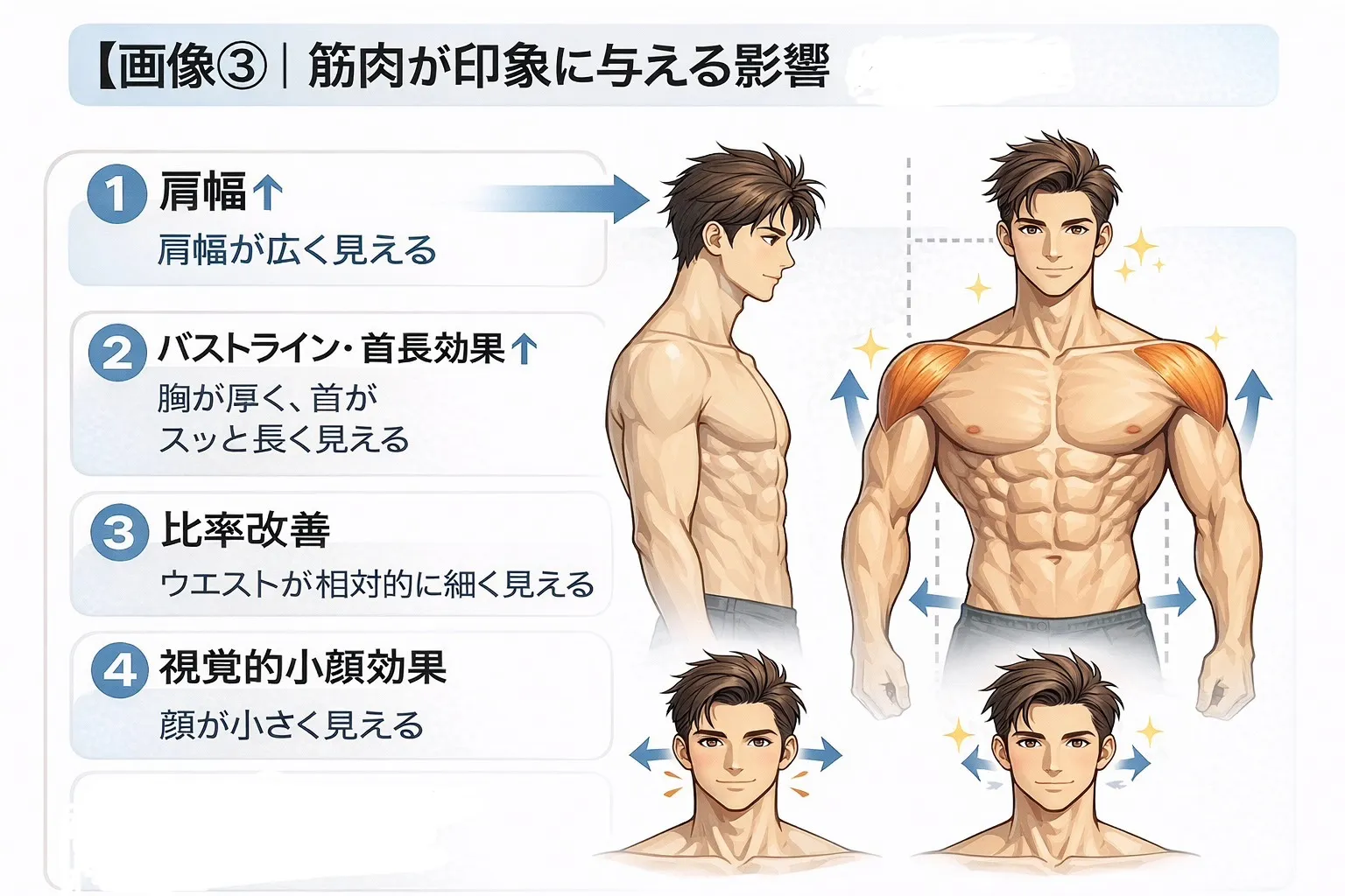 これは進化発生学的にも、人間が他者の体型を知覚する際に、肩幅とウエストの比率(いわゆるVシェイプ)が健康・若さ・魅力の指標として評価されるとされています。(身体構造が第一印象に影響するという一般理論)
