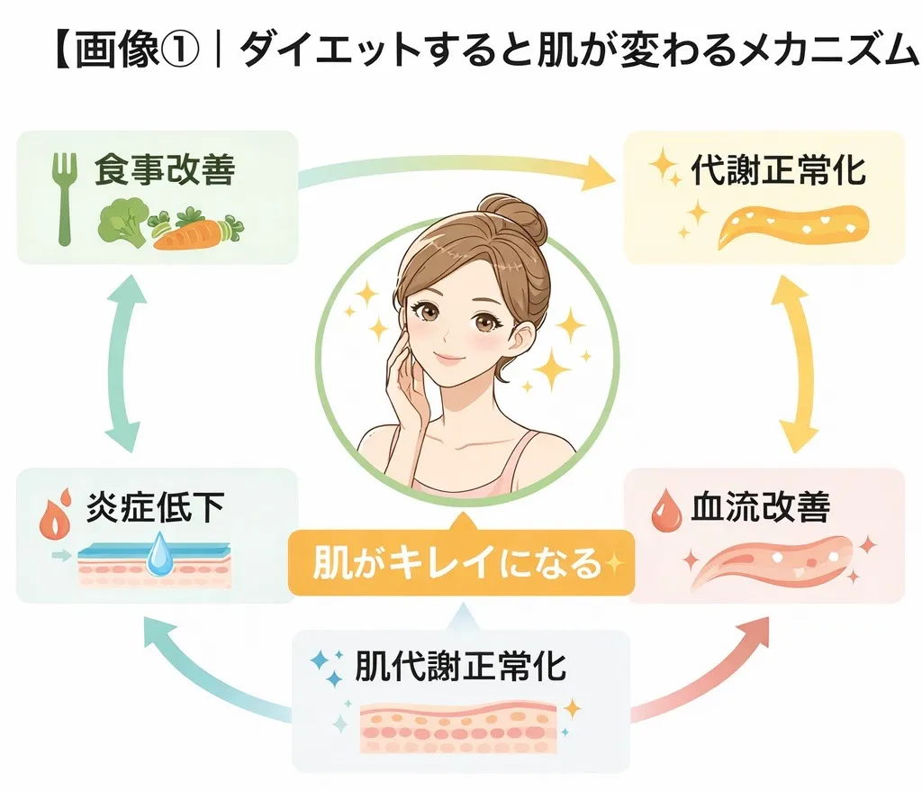 つまり、ダイエット成功による変化は、体の内側が変わった結果として肌に現れるのです。