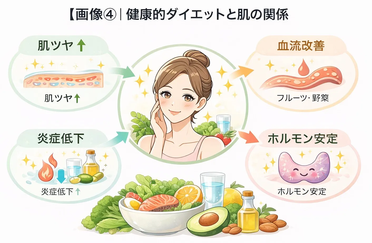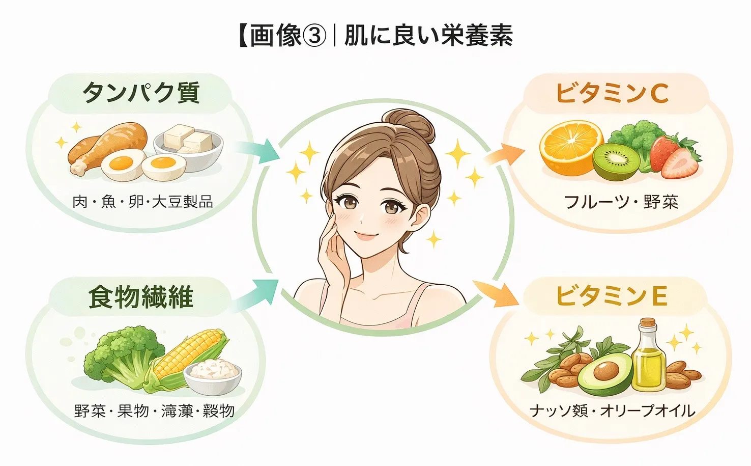 特に タンパク質と抗酸化物質 は肌の健康に直結します。
