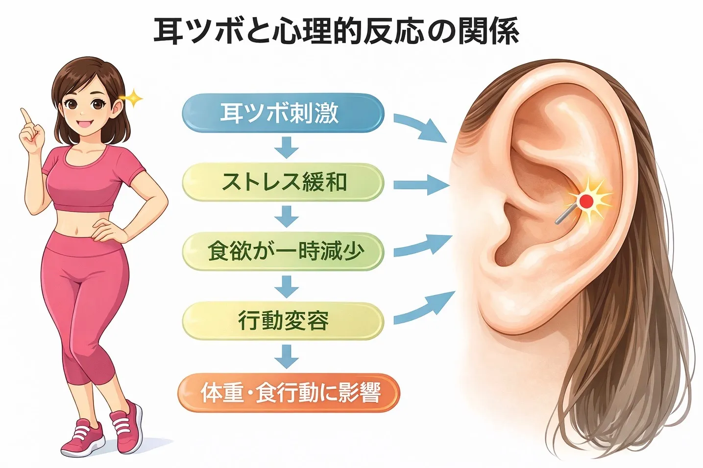耳ツボ刺激がこれらを統合的に変えるという生理学的メカニズムは、現在のエビデンスには見られません。