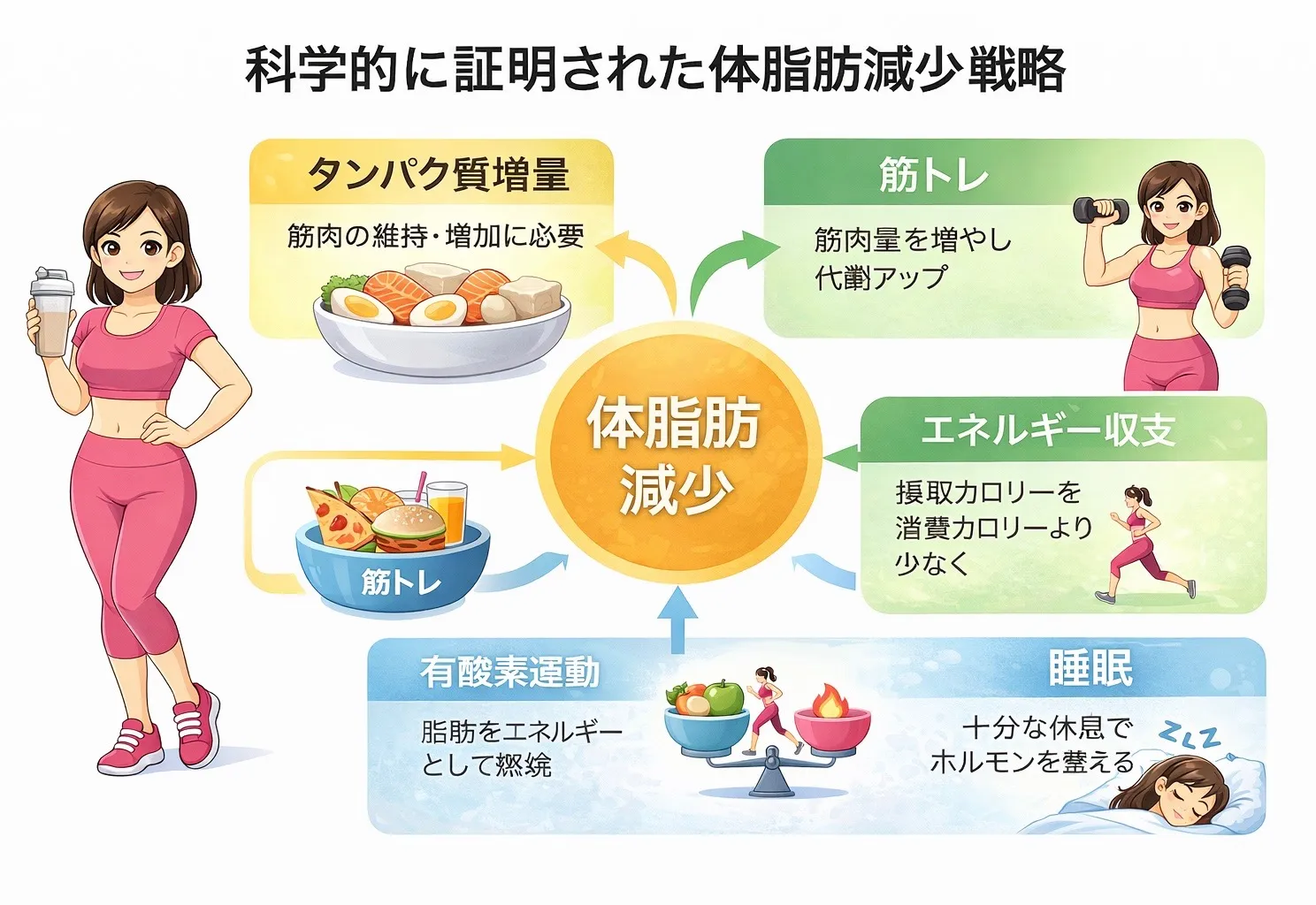 体脂肪を確実に減らしたいなら、科学的に効果が認められている要素に注目することが重要です: